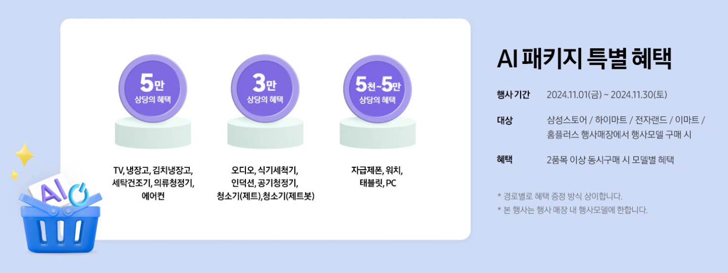 여러 품목을 동시에 구매하시는 분들을 위해 '스마트 패키지' 혜택이 준비되어 있습니다. 구매 제품 및 품목 수에 따라 최대 495만 원 상당의 혜택을 받을 수 있으며, 특히 AI 제품을 2개 이상 구매 시 최대 5만 원의 추가 할인이 제공됩니다.