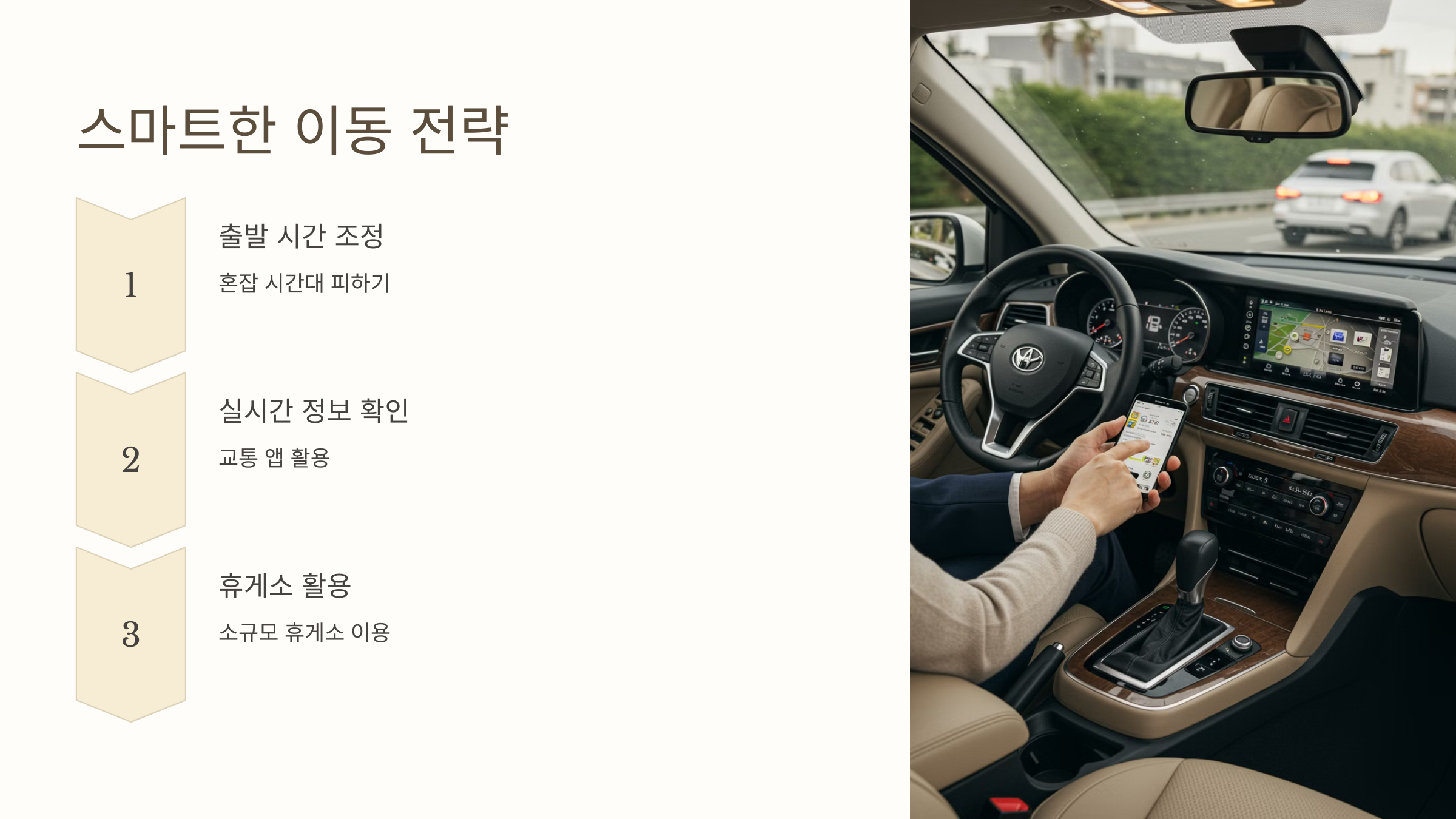 • 앱 추천: T맵, 카카오내비, 네이버 지도 등에서 실시간 교통 상황을 확인하세요.