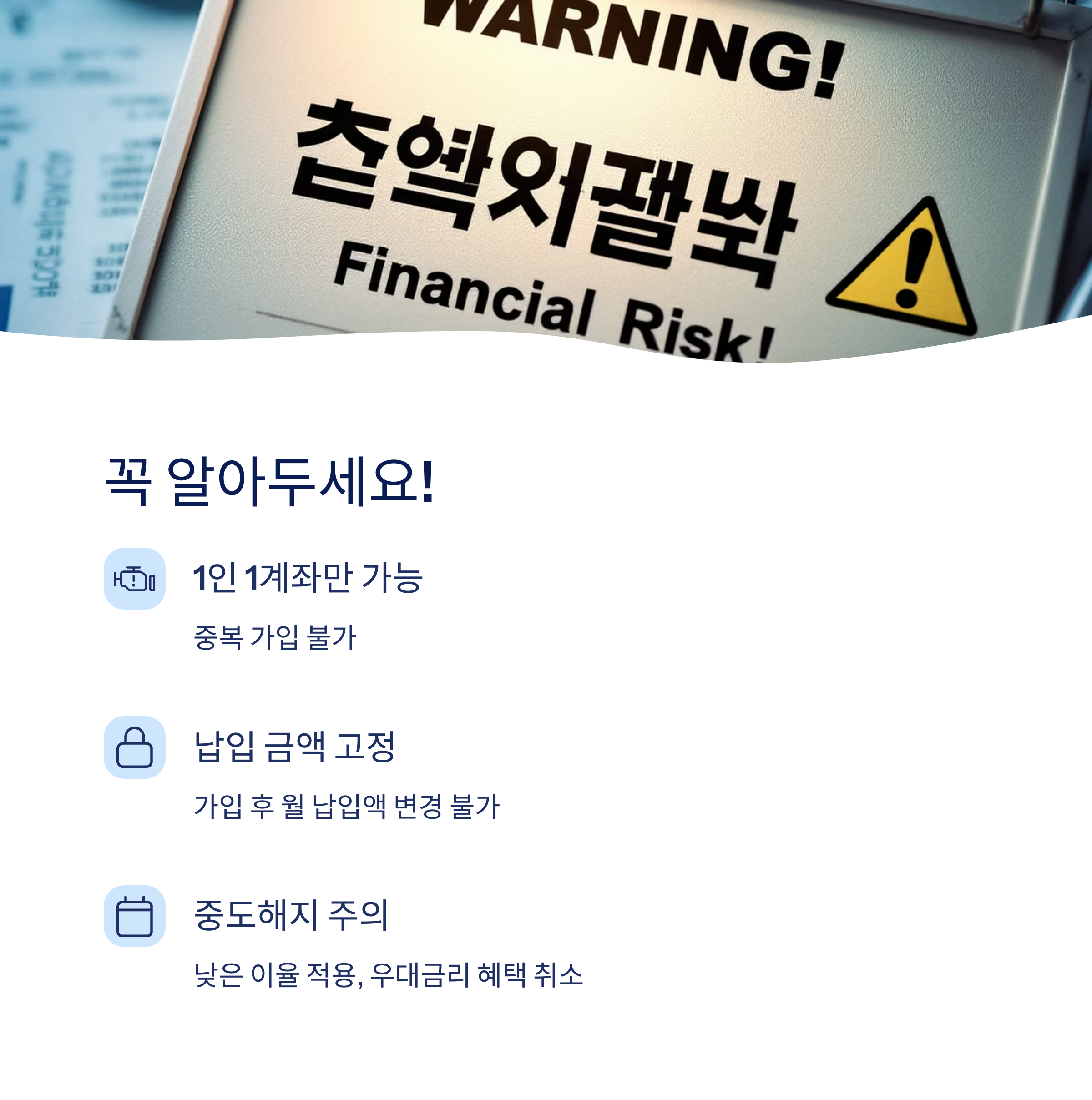 • 중도 해지 시 불이익: 중도 해지 시 기본 이자율보다 낮은 중도해지 이율이 적용되며, 우대금리 및 카드 연계 혜택도 소급 취소될 수 있음