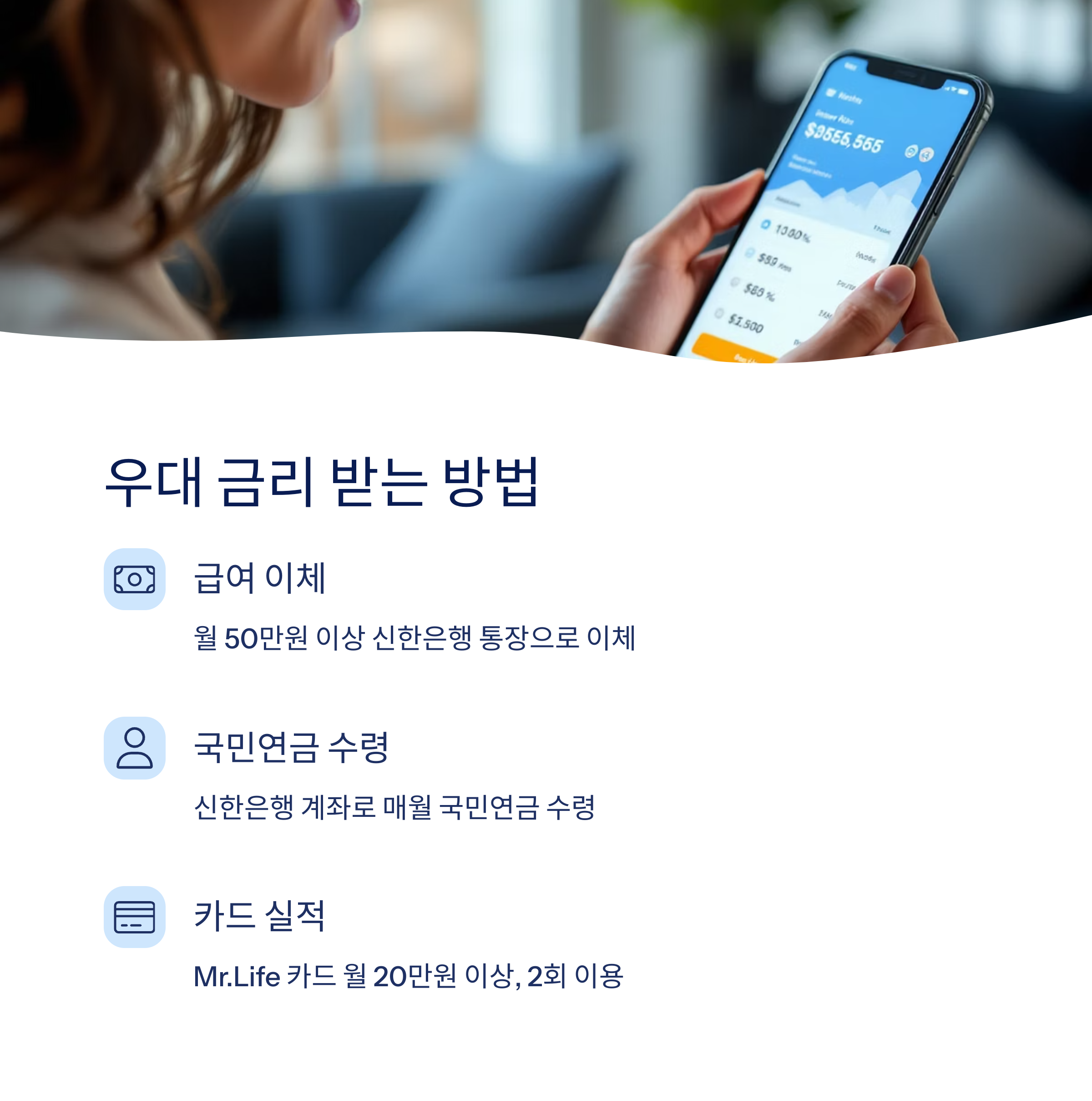 ※ 신한카드 Mr.Life 카드 연계 시 추가 금리 혜택 적용 가능(최대 연 8.5%p 추가)