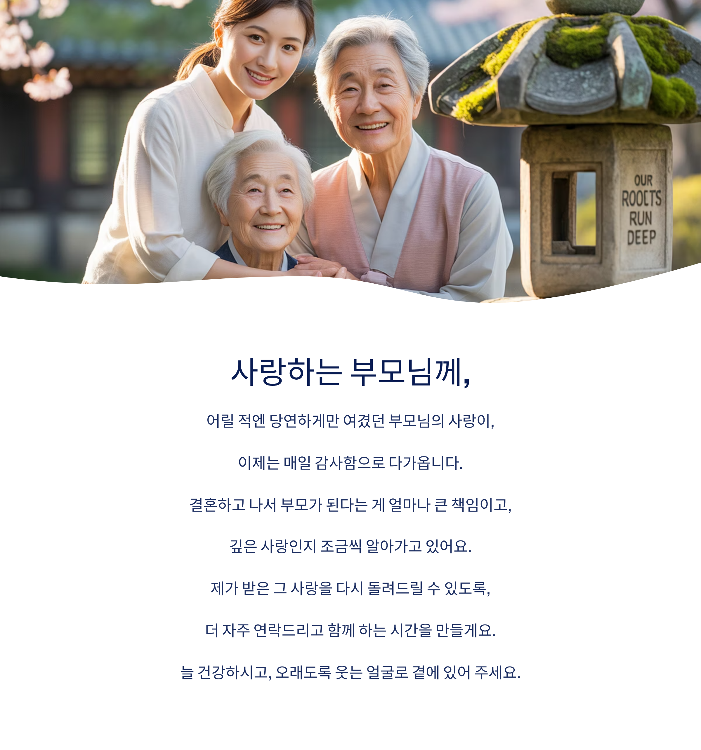 어릴 적엔 당연하게만 여겼던 부모님의 사랑이, 이제는 매일 감사함으로 다가옵니다.