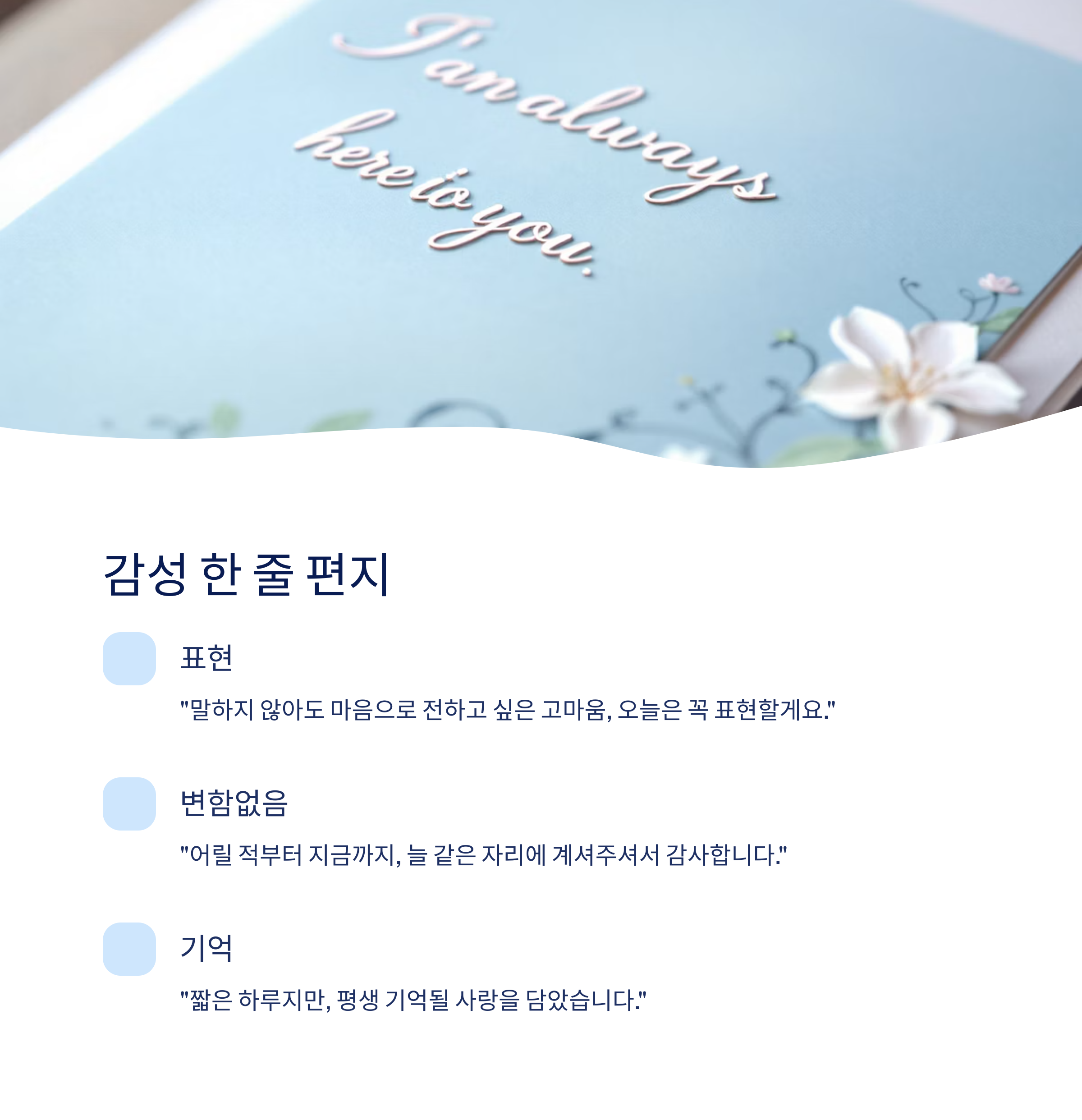 - “말하지 않아도 마음으로 전하고 싶은 고마움, 오늘은 꼭 표현할게요.”