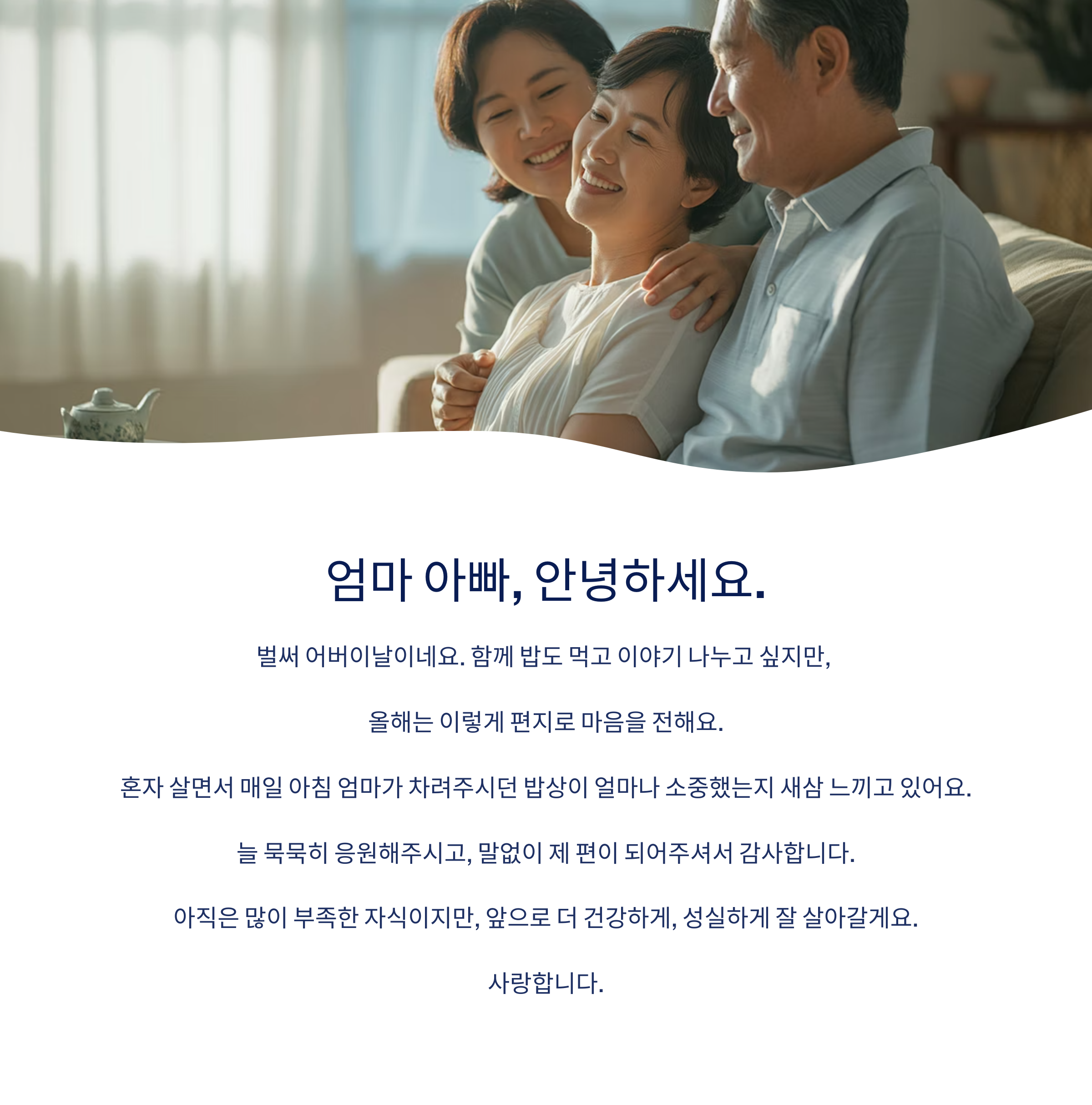 벌써 어버이날이네요. 함께 밥도 먹고 이야기 나누고 싶지만, 올해는 이렇게 편지로 마음을 전해요.