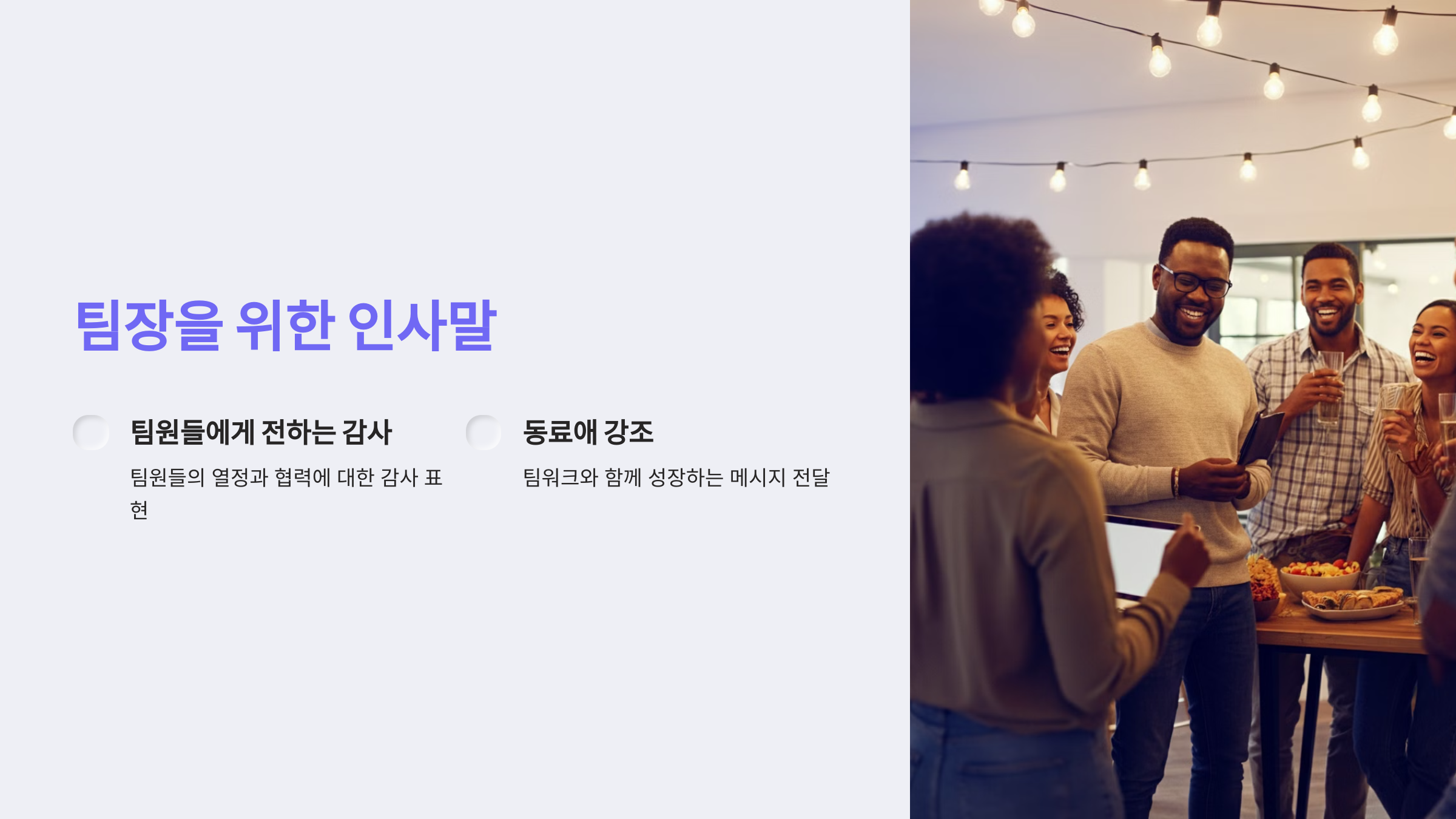“팀원 여러분, 한 해 동안 정말 수고 많으셨습니다. 여러분의 열정과 협력 덕분에 우리가 많은 성과를 이룰 수 있었습니다. 앞으로도 서로를 믿고 응원하며 더 큰 목표를 향해 나아갑시다. 새해에는 모두의 삶에 행복과 성공이 가득하길 바랍니다.”
