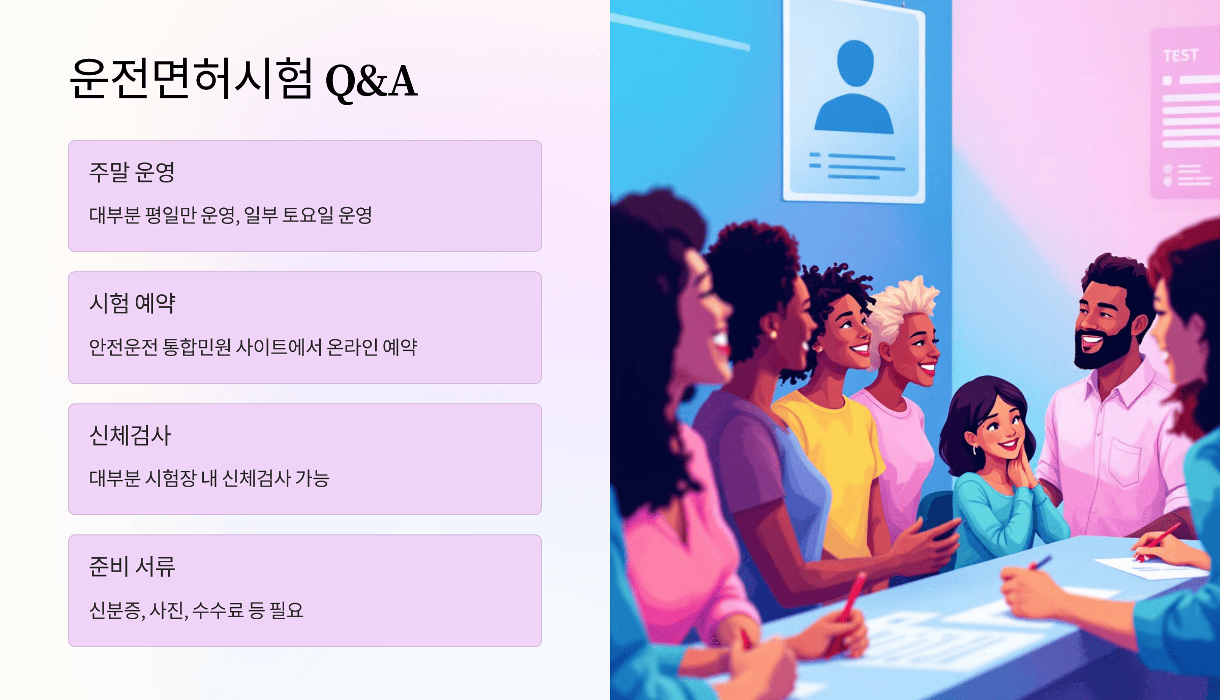 A5: 응시하려는 시험의 종류에 따라 준비 서류가 다를 수 있지만, 기본적으로 신분증, 여권 사진 1~2장(여권용), 수수료(카드 결제 가능), 기존 면허증(갱신 또는 변경 시)을 준비해야 합니다. 정확한 서류 목록은 예약 시 확인 가능합니다.