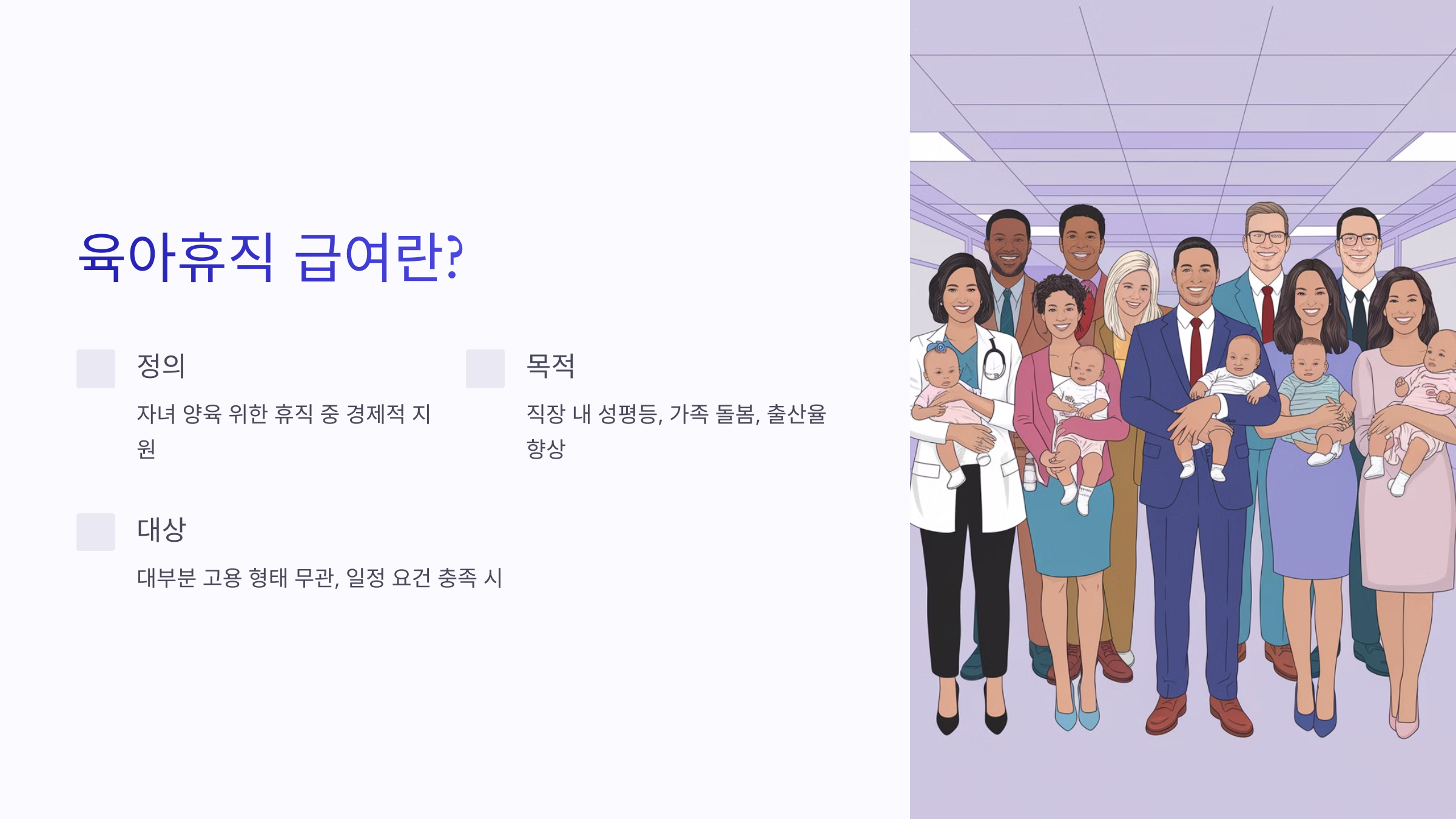 - 목적: 직장 내 성평등 증진, 가족 돌봄 지원, 출산율 향상