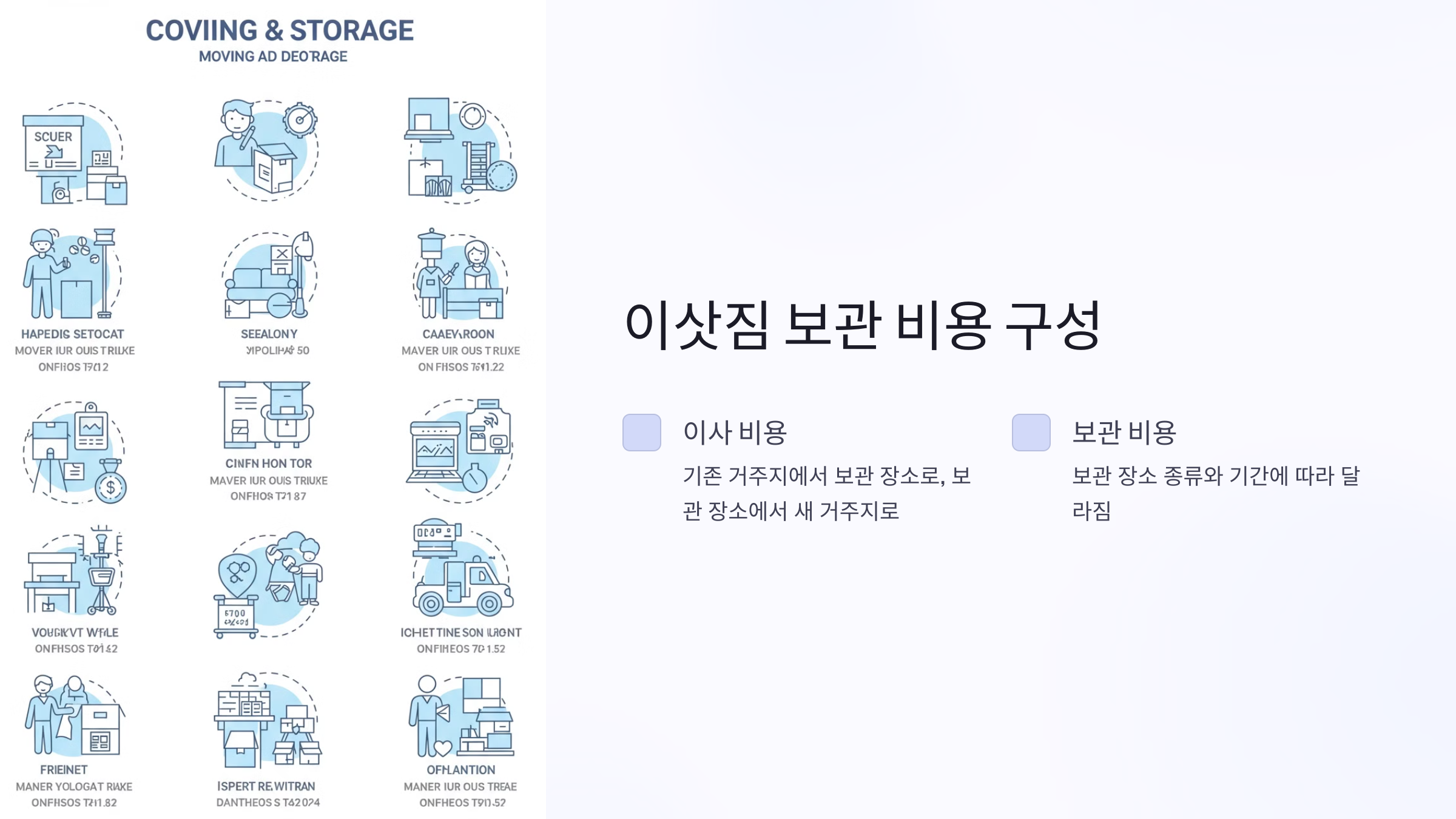 • 이사 비용: 기존 거주지에서 보관 장소로, 그리고 보관 장소에서 새로운 거주지로의 이사 비용이 각각 발생합니다.