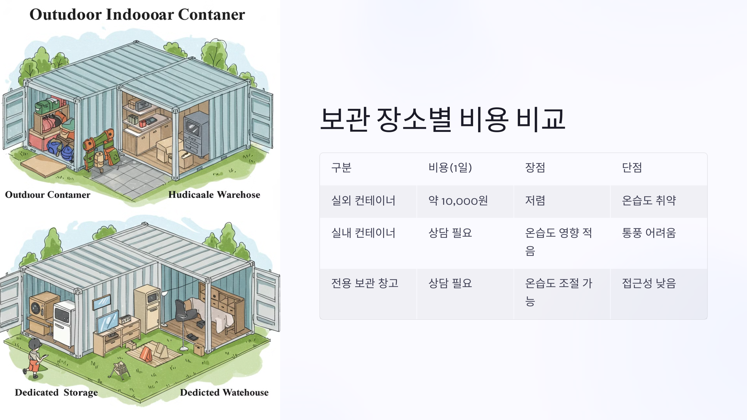보관 장소는 크게 실외 컨테이너, 실내 컨테이너, 전용 보관 창고로 나눌 수 있습니다. 각 보관 장소의 특징과 비용은 다음과 같습니다: