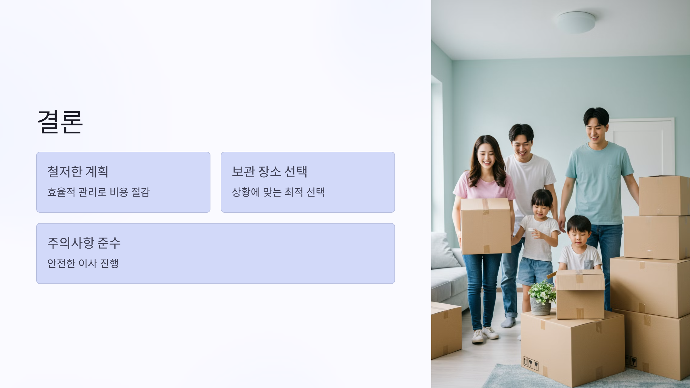 이삿짐 보관이사는 추가 비용이 발생하지만, 철저한 계획과 준비를 통해 효율적으로 관리할 수 있습니다. 보관 장소의 선택, 주의사항 준수, 그리고 비용 절약을 위한 전략을 통해 안전하고 경제적인 이사를 진행하시기 바랍니다.