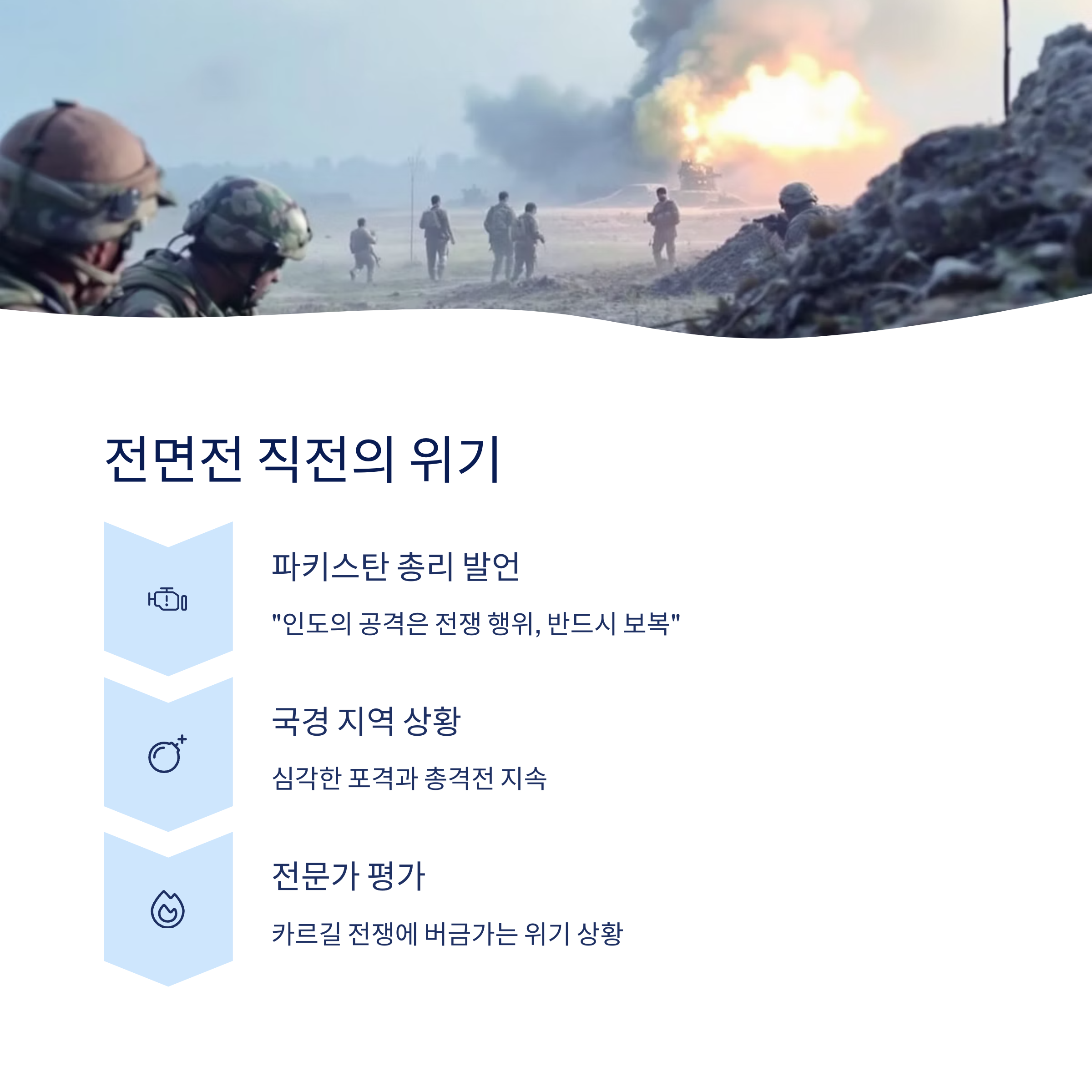 파키스탄은 인도 전투기 격추, 군사시설 타격 등을 통해 강력하게 보복하고 있으며, 총리와 국방장관 모두 ‘전쟁 행위’라고 규정하고 있습니다.
