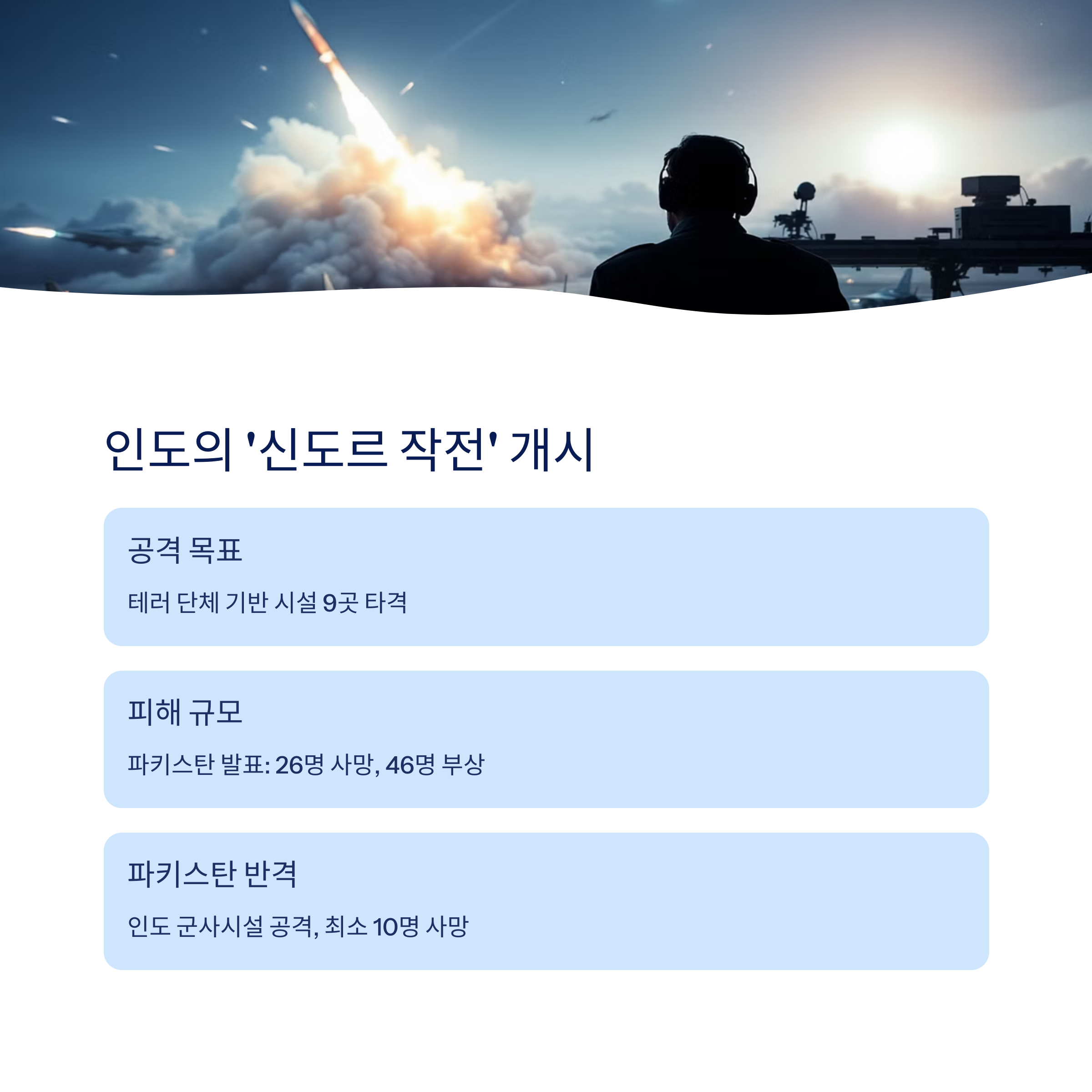 2025년 4월 23일 카슈미르 바이사란 계곡에서 발생한 테러 공격이 발단이 되었습니다. 인도는 이 테러의 배후에 파키스탄이 있다고 주장하고 있으며, 이에 군사적 대응을 개시했습니다.