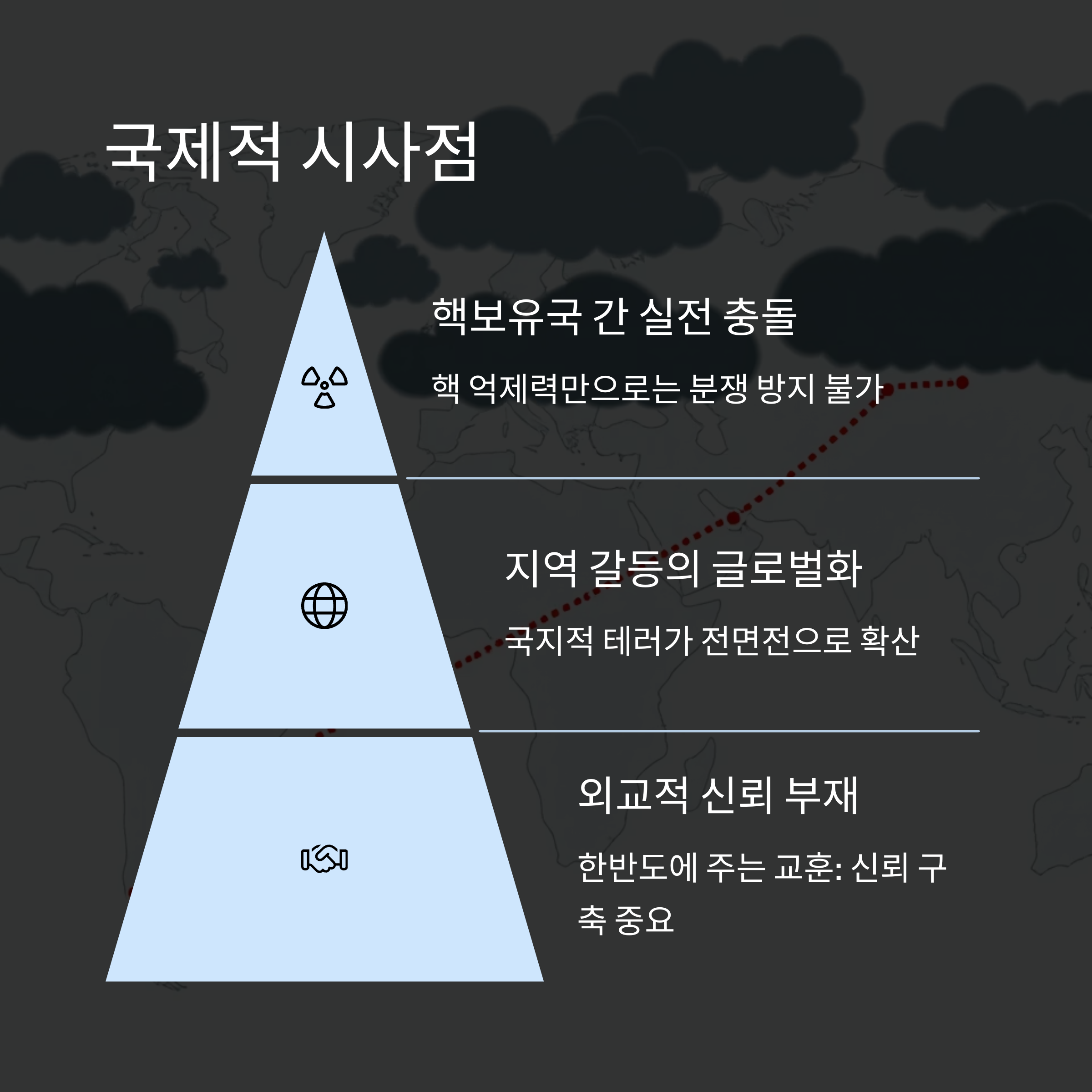 → 핵무기를 가진 국가들 간에도 '실제 군사력 사용'은 언제든 발생할 수 있으며, 군사적 억제력만으로는 분쟁을 막을 수 없다는 점을 보여줌