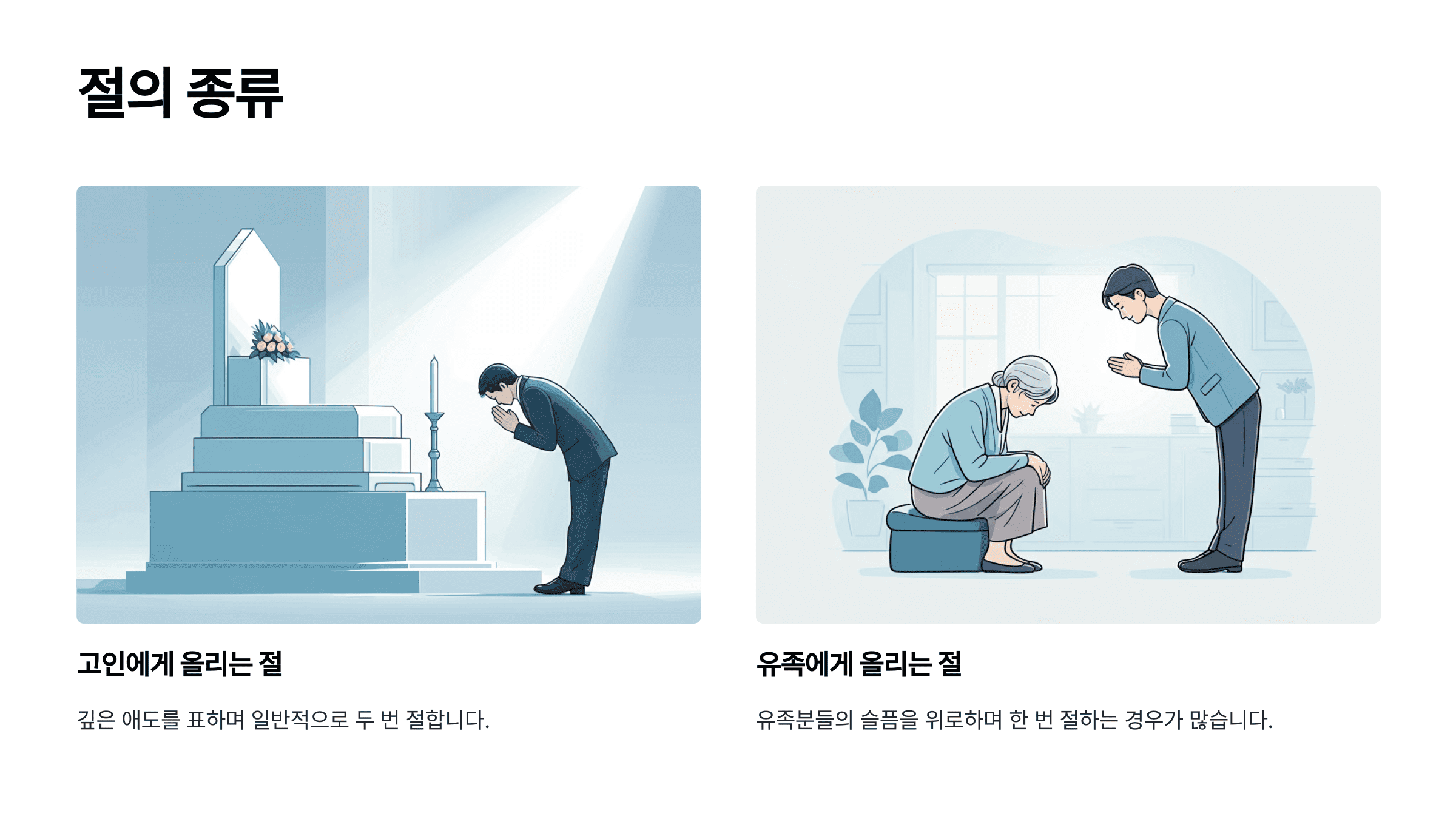 • 고인에게 올리는 절: 고인 앞에서 조의를 표하며 하는 절로, 두 번 절하는 경우가 일반적입니다.