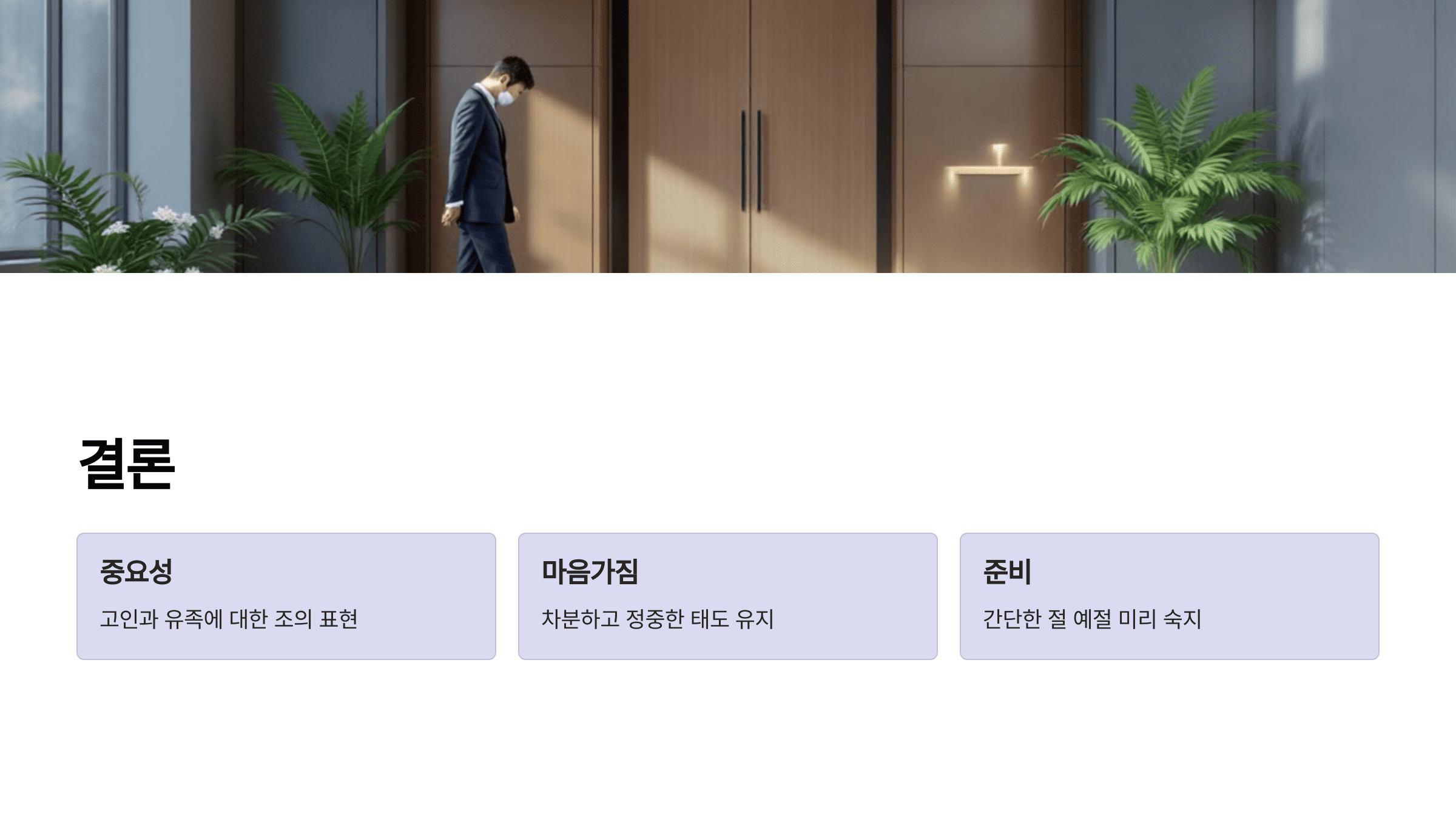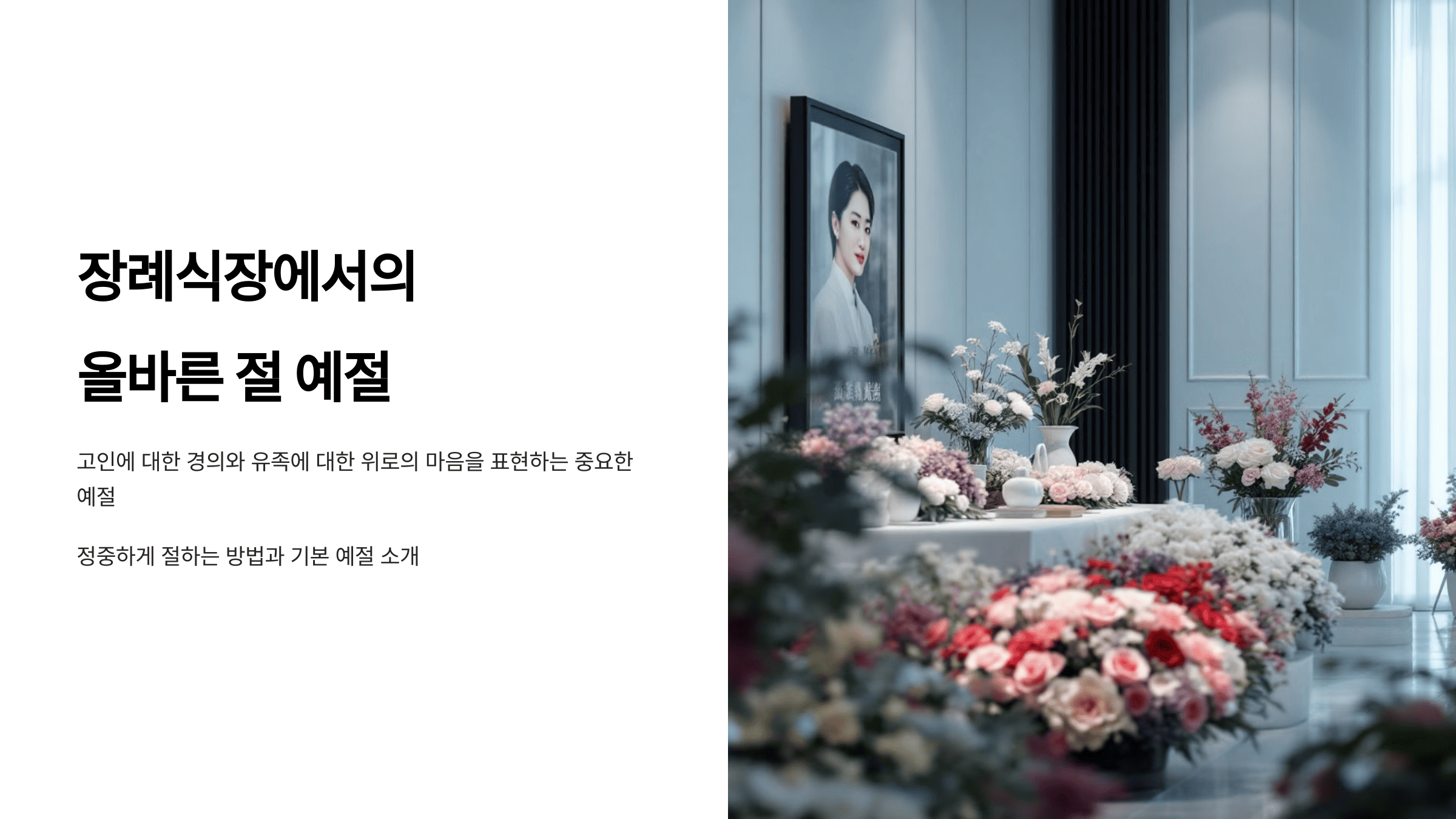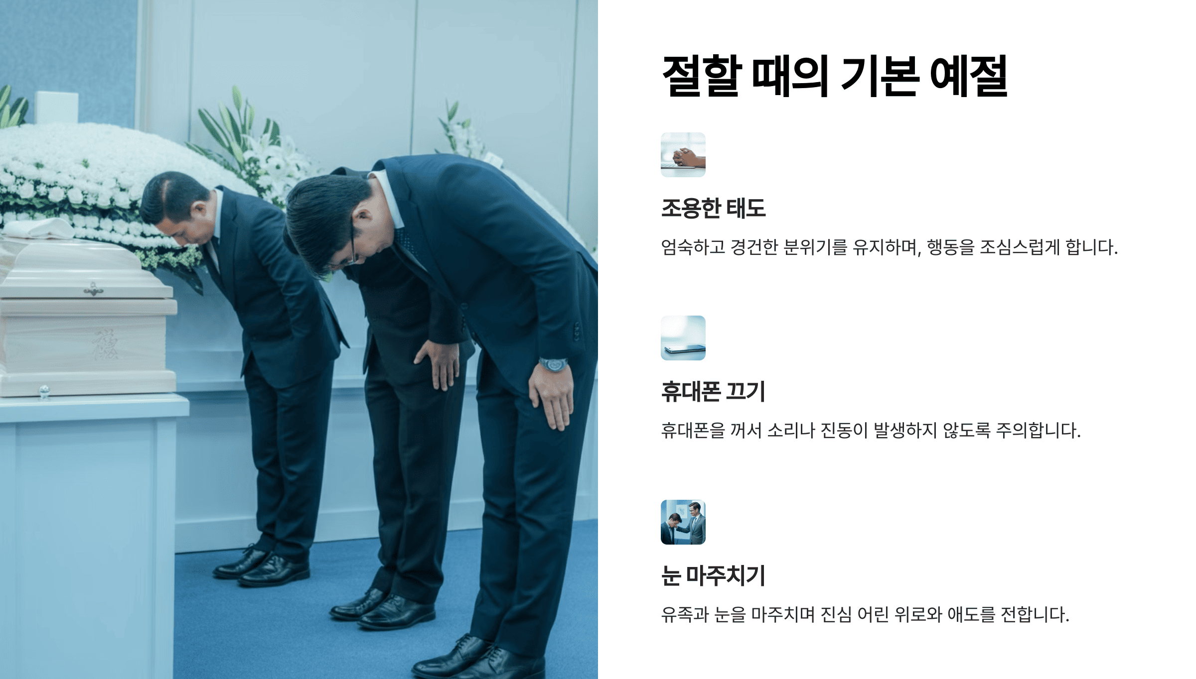 • 조용한 태도 유지: 장례식장은 엄숙한 분위기이므로, 절을 할 때는 조용하고 차분하게 행동합니다.
