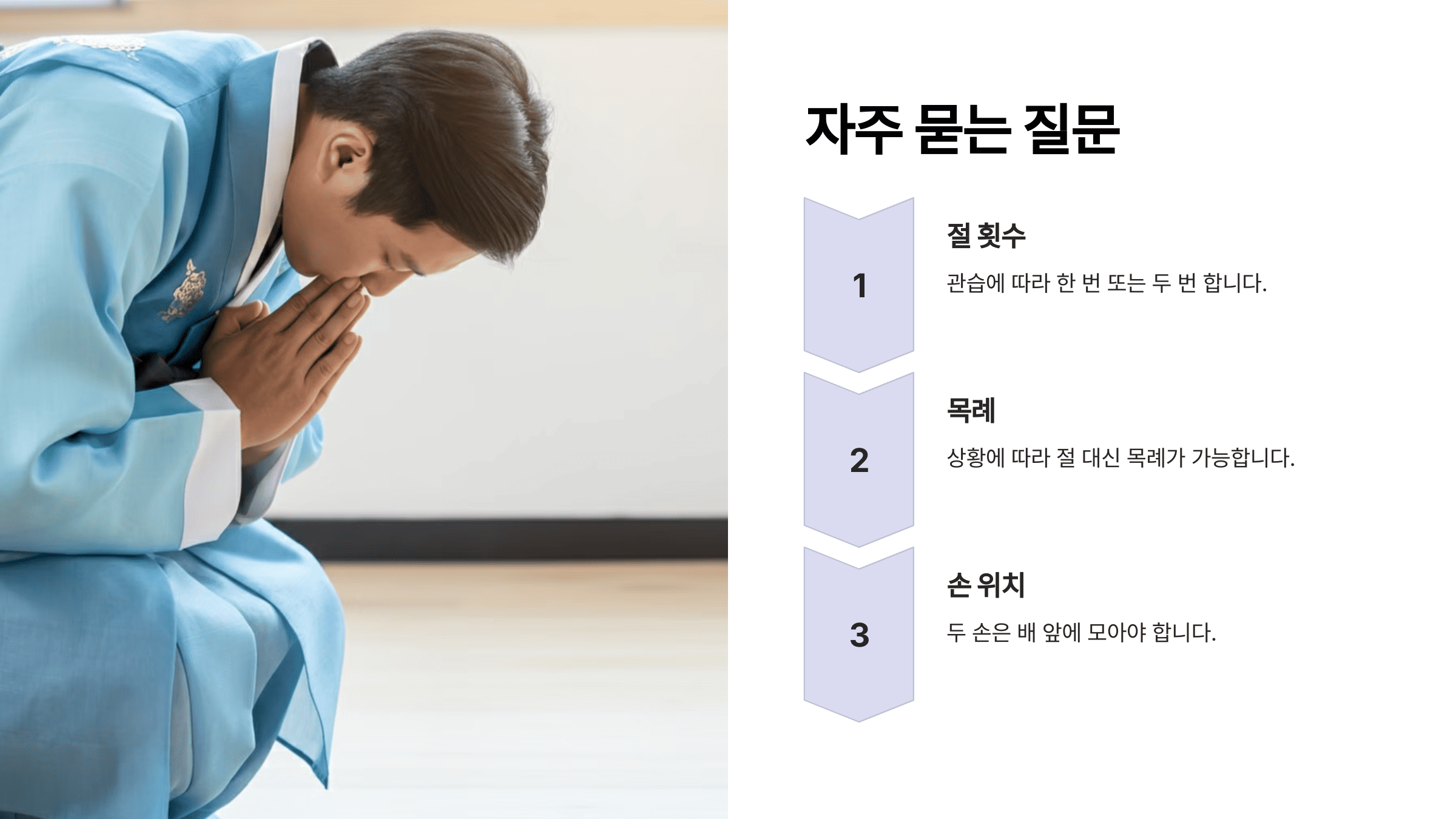 • 겸손한 마음가짐: 절을 할 때는 몸을 낮추고 겸손한 마음으로 고인을 기리는 마음을 담아 절합니다.