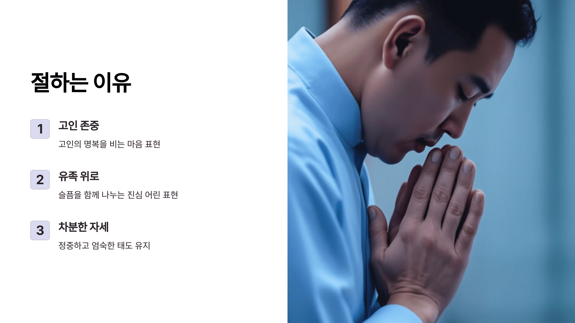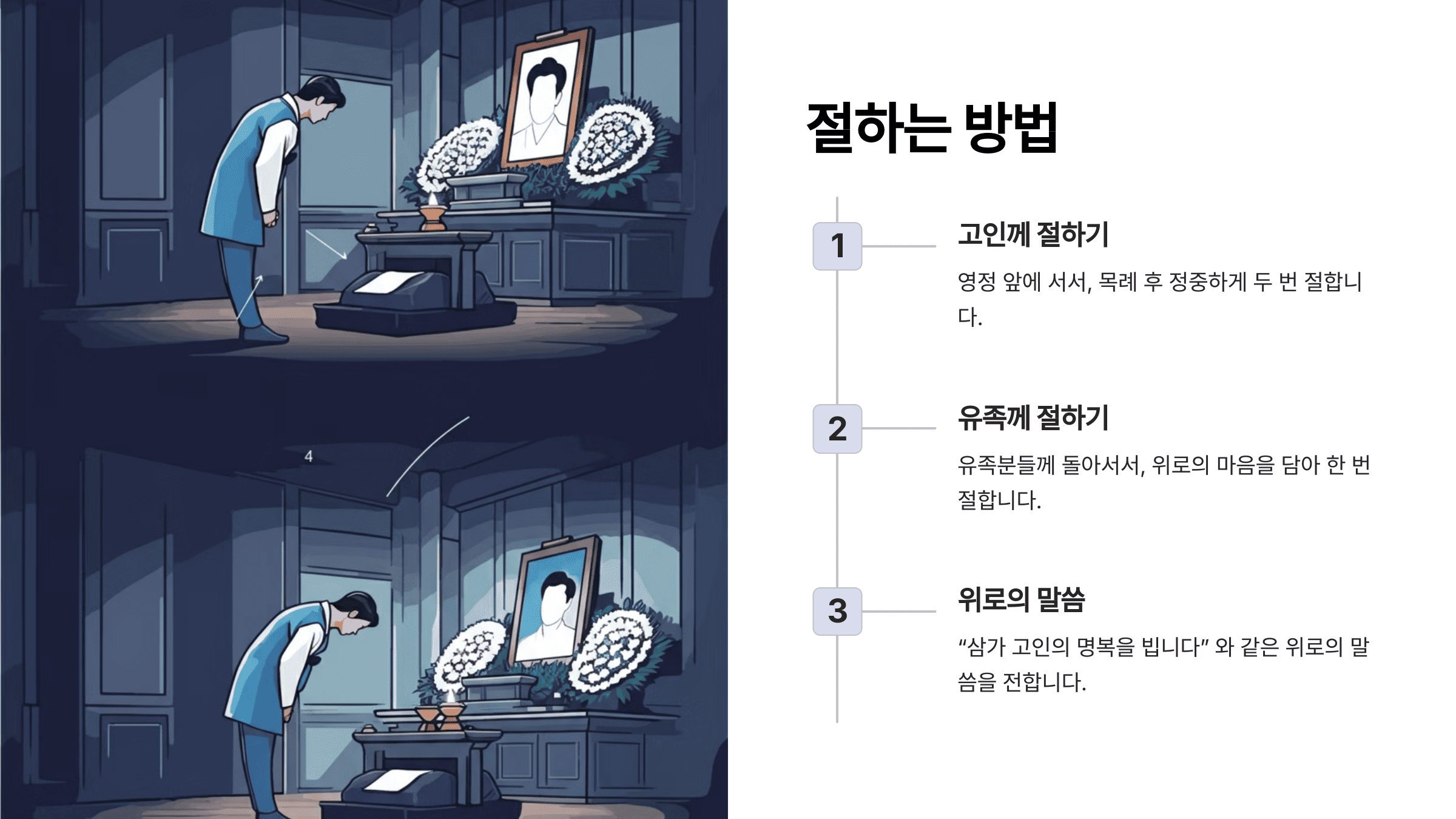 - 조용한 태도 유지: 장례식장은 엄숙한 분위기이므로, 절을 할 때는 조용하고 차분하게 행동합니다.