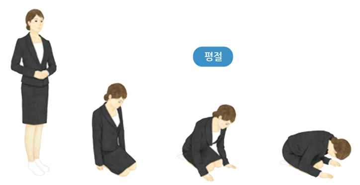 - 두 손을 배 앞에 모으고, 허리를 깊게 굽히며 천천히 절을 합니다.
