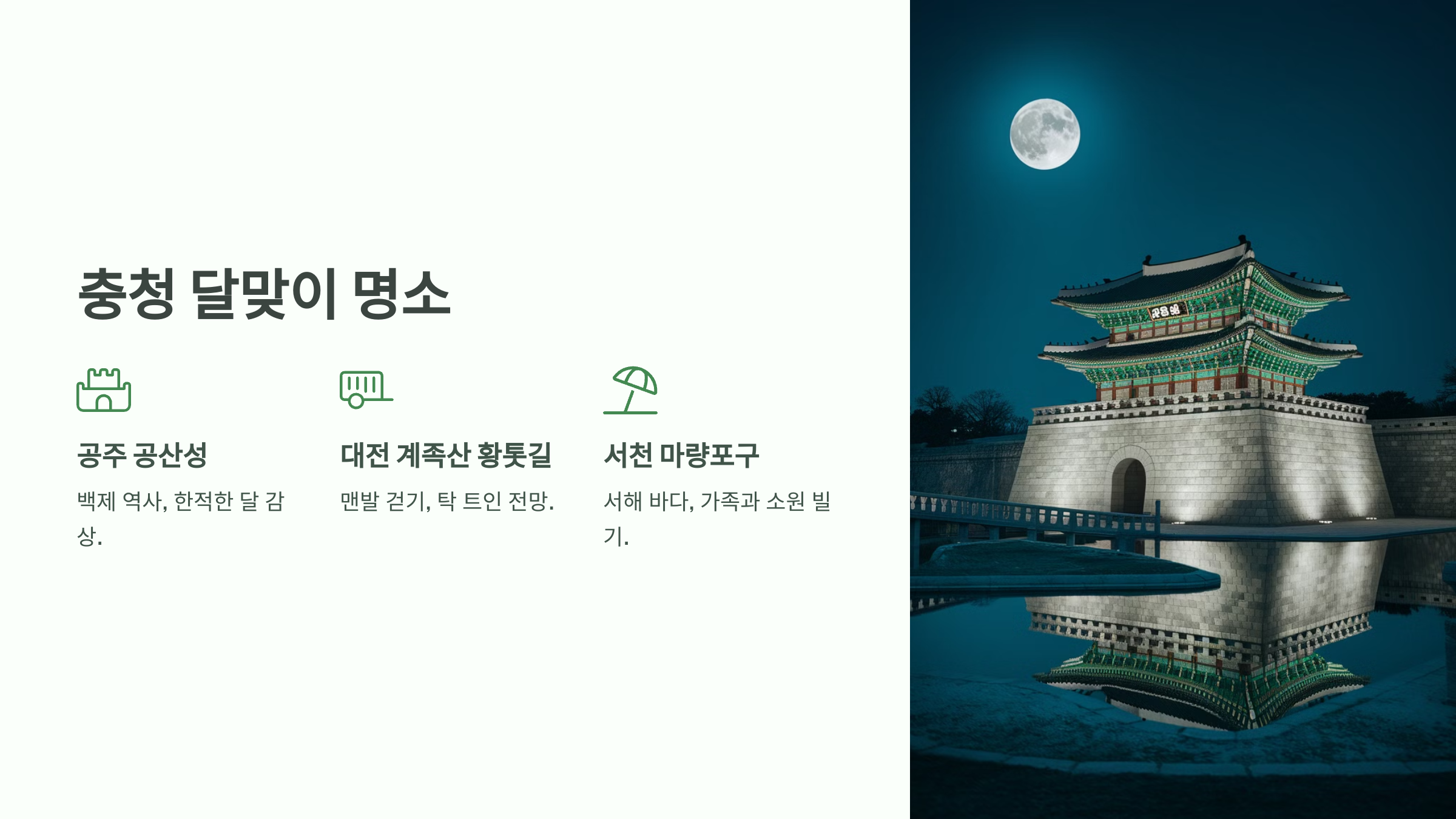 • 특징: 백제의 역사가 깃든 성곽에서 감상하는 보름달이 인상적인 곳입니다.