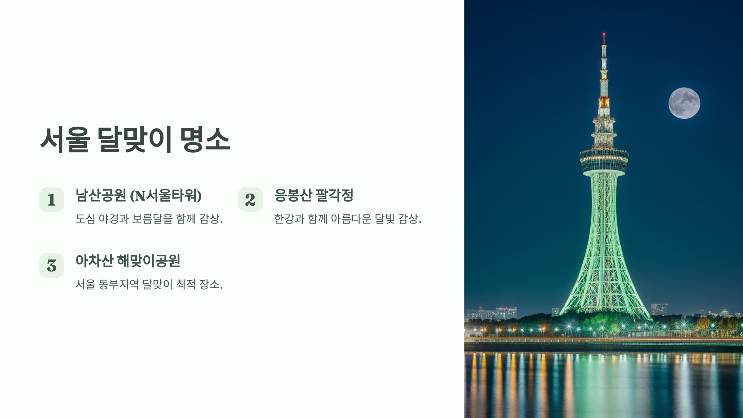 • 특징: 서울 도심 한가운데에서 탁 트인 야경과 함께 달을 감상할 수 있는 명소입니다.