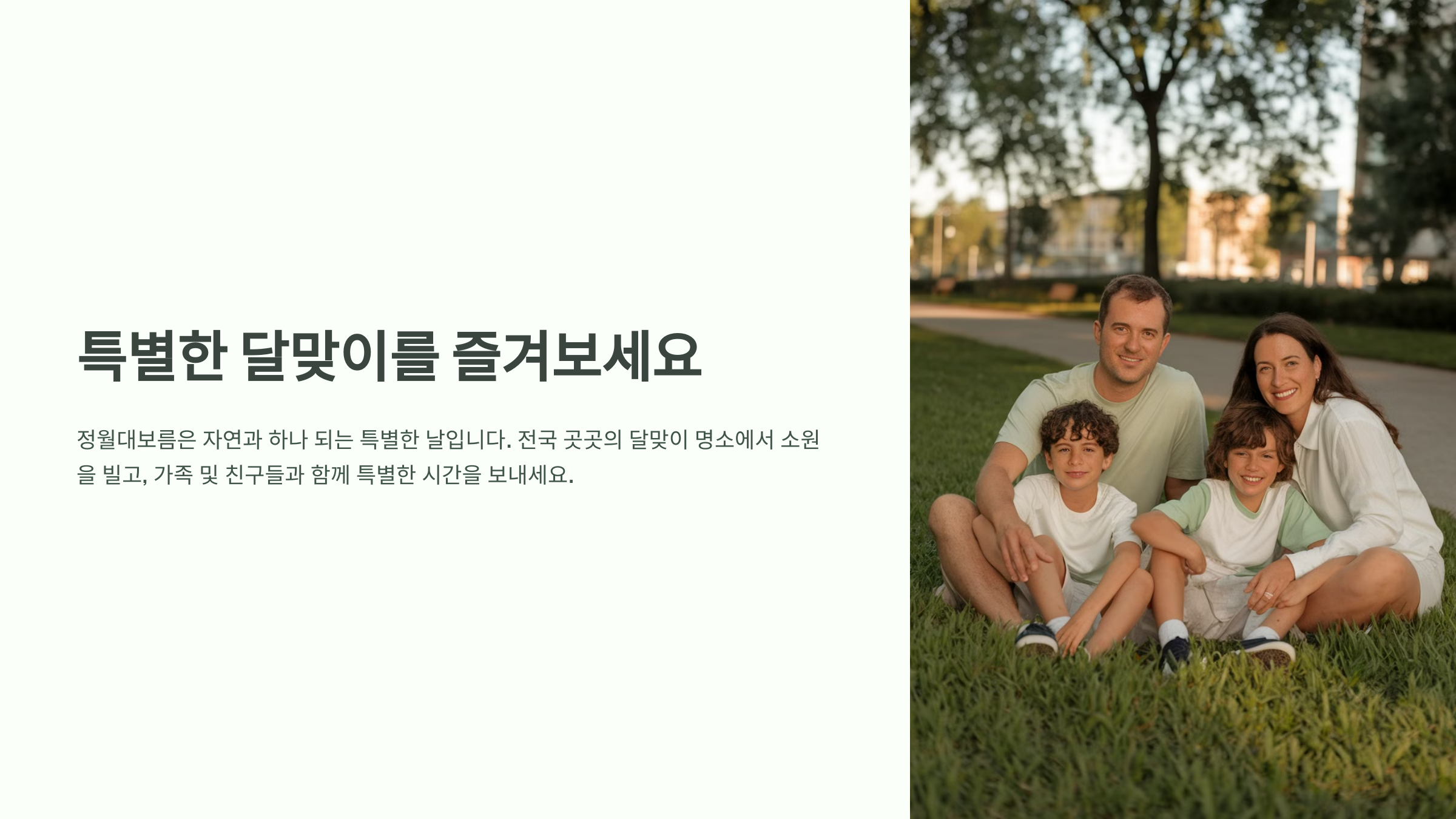 정월대보름은 단순한 명절이 아니라, 자연과 하나 되는 특별한 날입니다. 전국 곳곳에서 아름다운 달맞이 명소를 찾아 소원을 빌고, 가족 및 친구들과 함께 특별한 시간을 보내보세요.