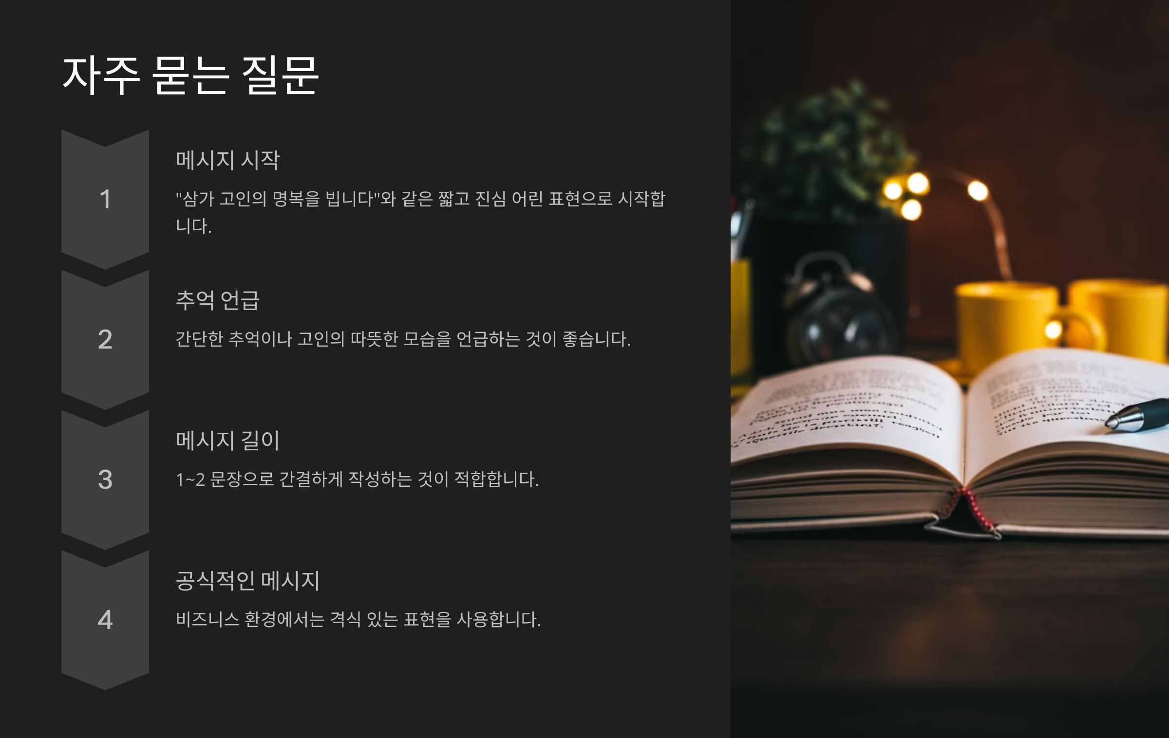A1: 애도 메시지는 "삼가 고인의 명복을 빕니다" 또는 "진심으로 위로의 마음을 전합니다"와 같이 짧고 진심 어린 표현으로 시작하는 것이 좋습니다.
