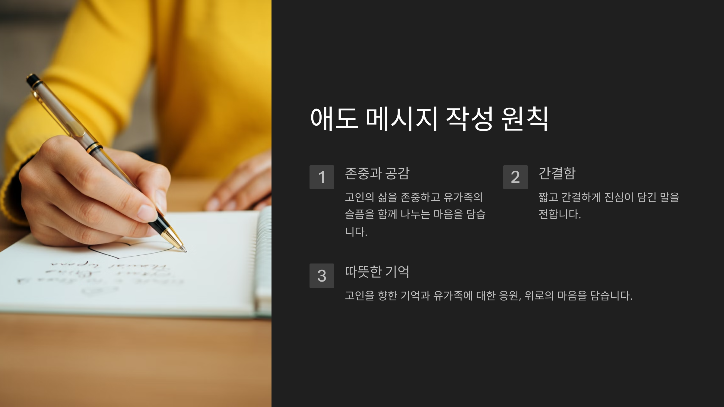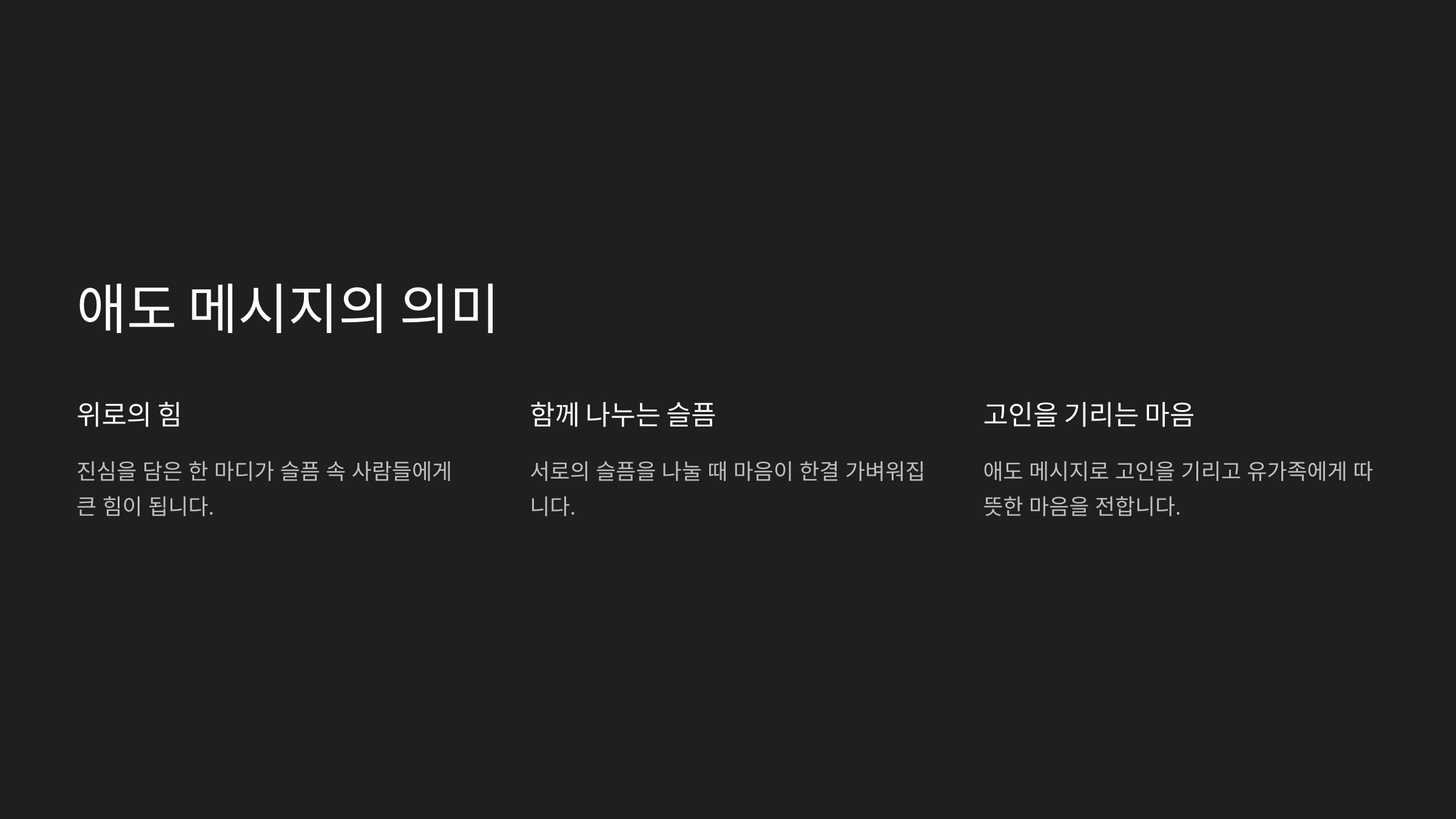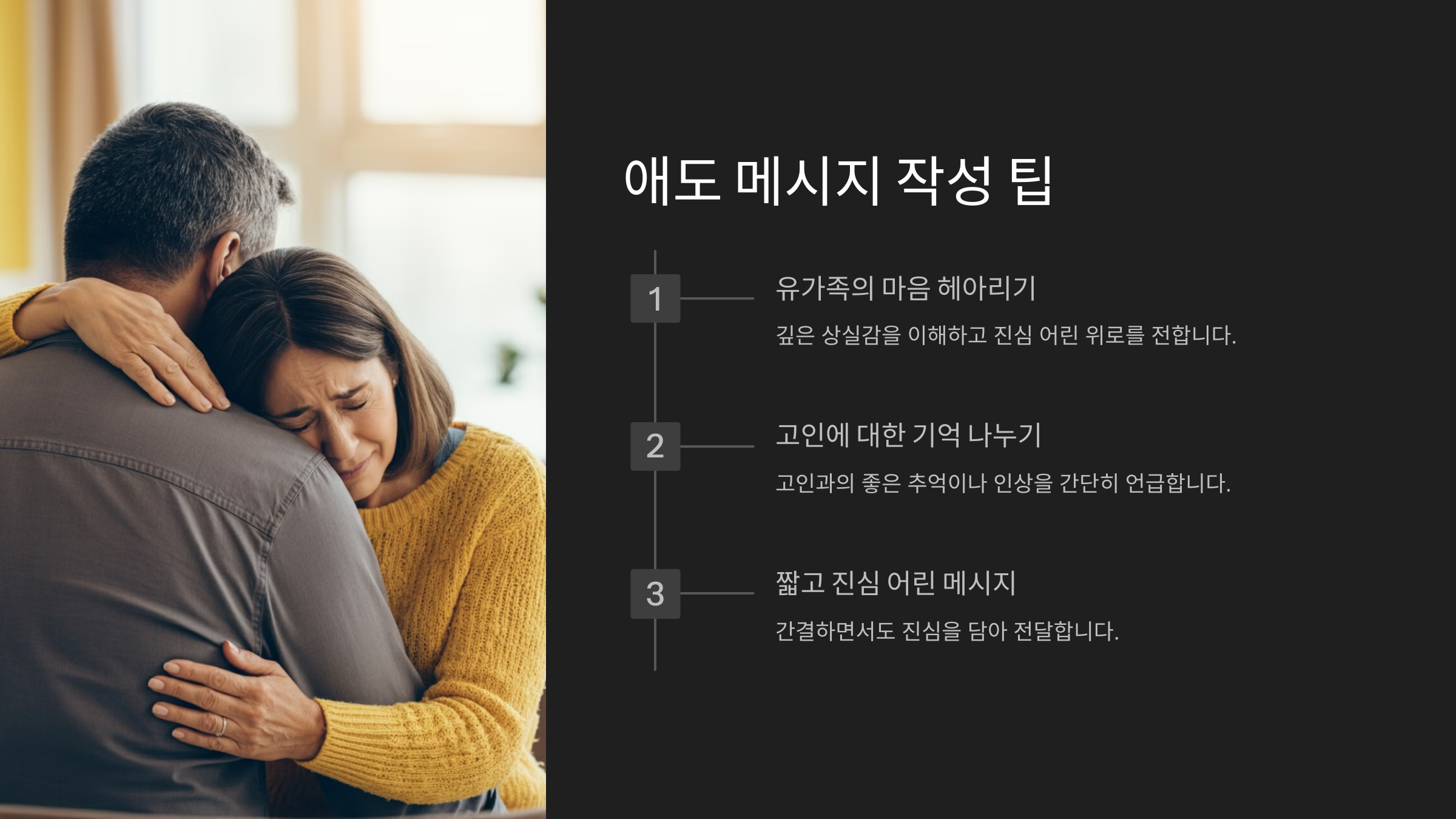 애도 메시지를 작성할 때는 고인의 삶을 존중하며 유가족의 슬픔을 함께 나누는 마음을 담는 것이 중요합니다. 너무 길거나 지나치게 화려한 표현보다는 짧고 간결하게 진심이 담긴 말을 전하는 것이 더 좋습니다. 고인을 향한 기억과 유가족에 대한 응원, 위로의 마음을 담아 작성해보세요.