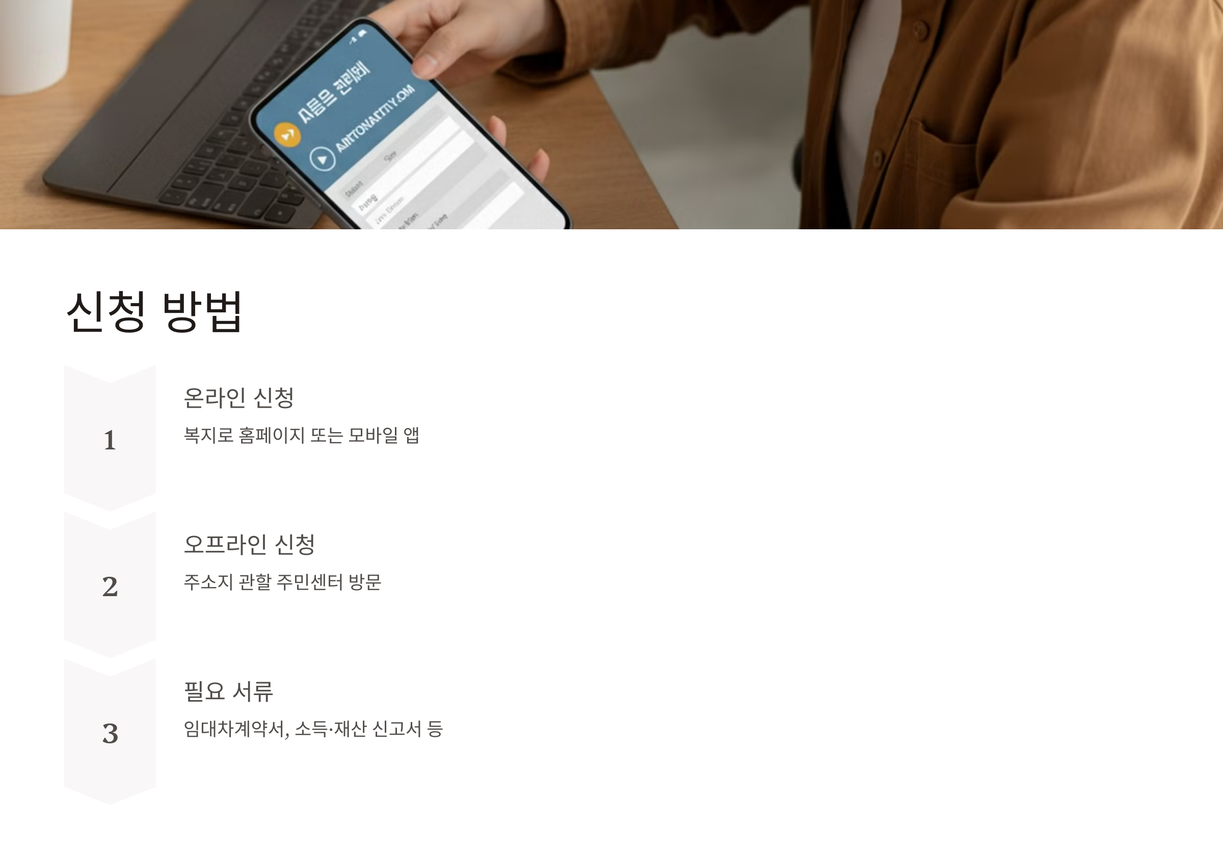 • 기타 조건: 공공임대주택 거주자, 다른 월세 지원 수혜자는 제외