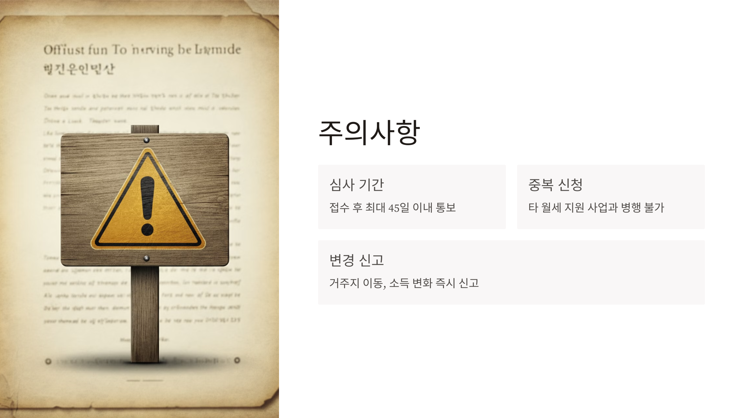 - 지원 대상 여부는 접수 후 최대 45일 이내 통보