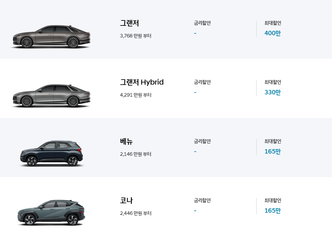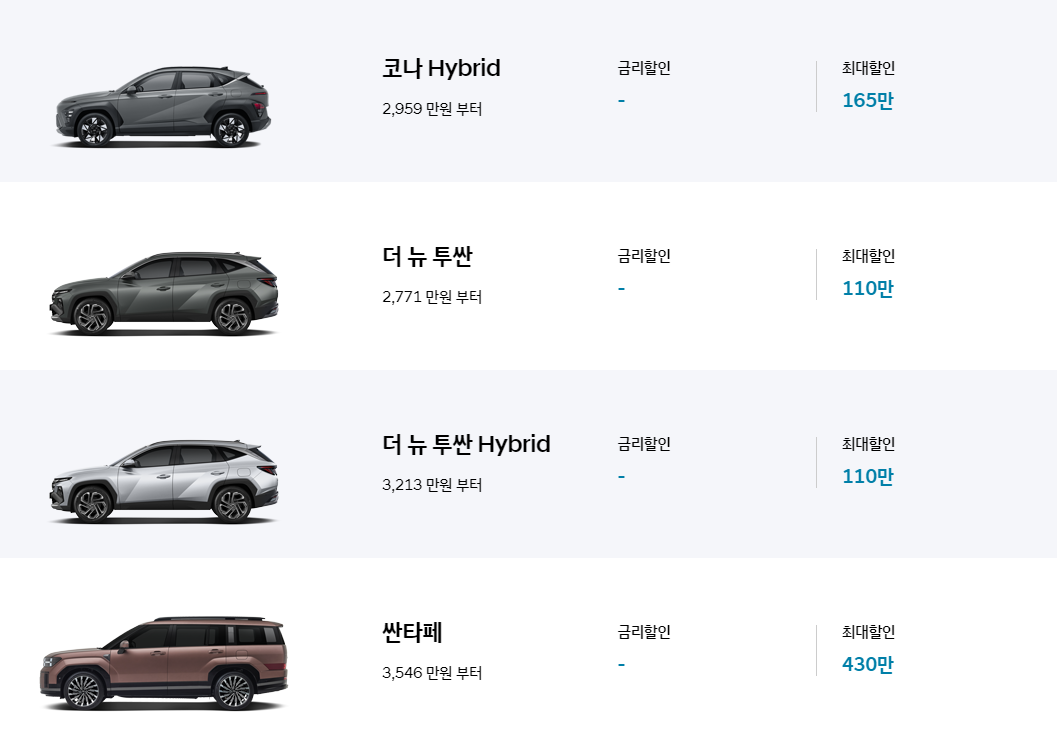 • 쏘나타, 그랜저, 싼타페 (하이브리드 포함): 최대 200만 원 할인