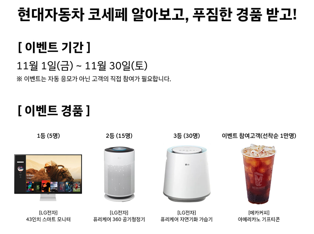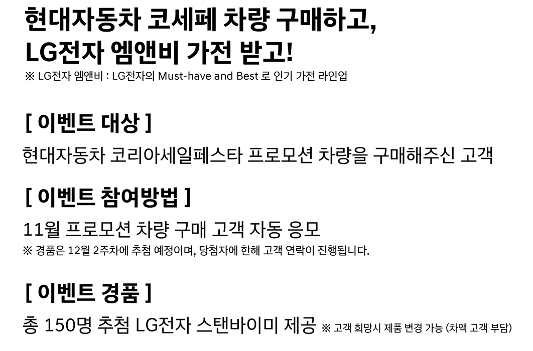 현대자동차 코세페 차량구매시 LG 가전 경품 추첨 이벤트 선물