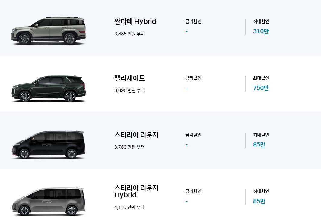 - 팰리세이드: 최대 500만 원 할인