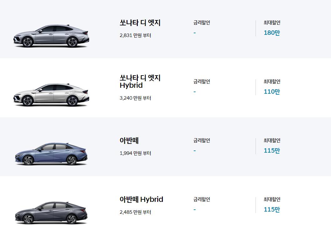 - 쏘나타, 그랜저, 싼타페 (하이브리드 포함): 최대 200만 원 할인