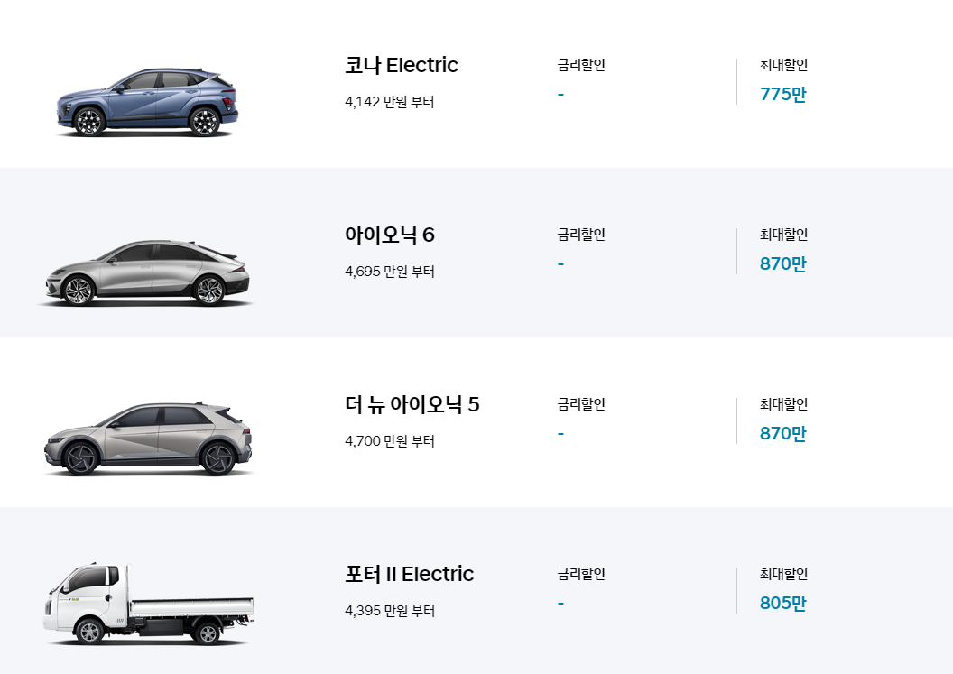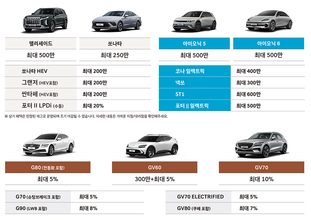 • 아이오닉 5, 아이오닉 6: 최대 500만 원 할인