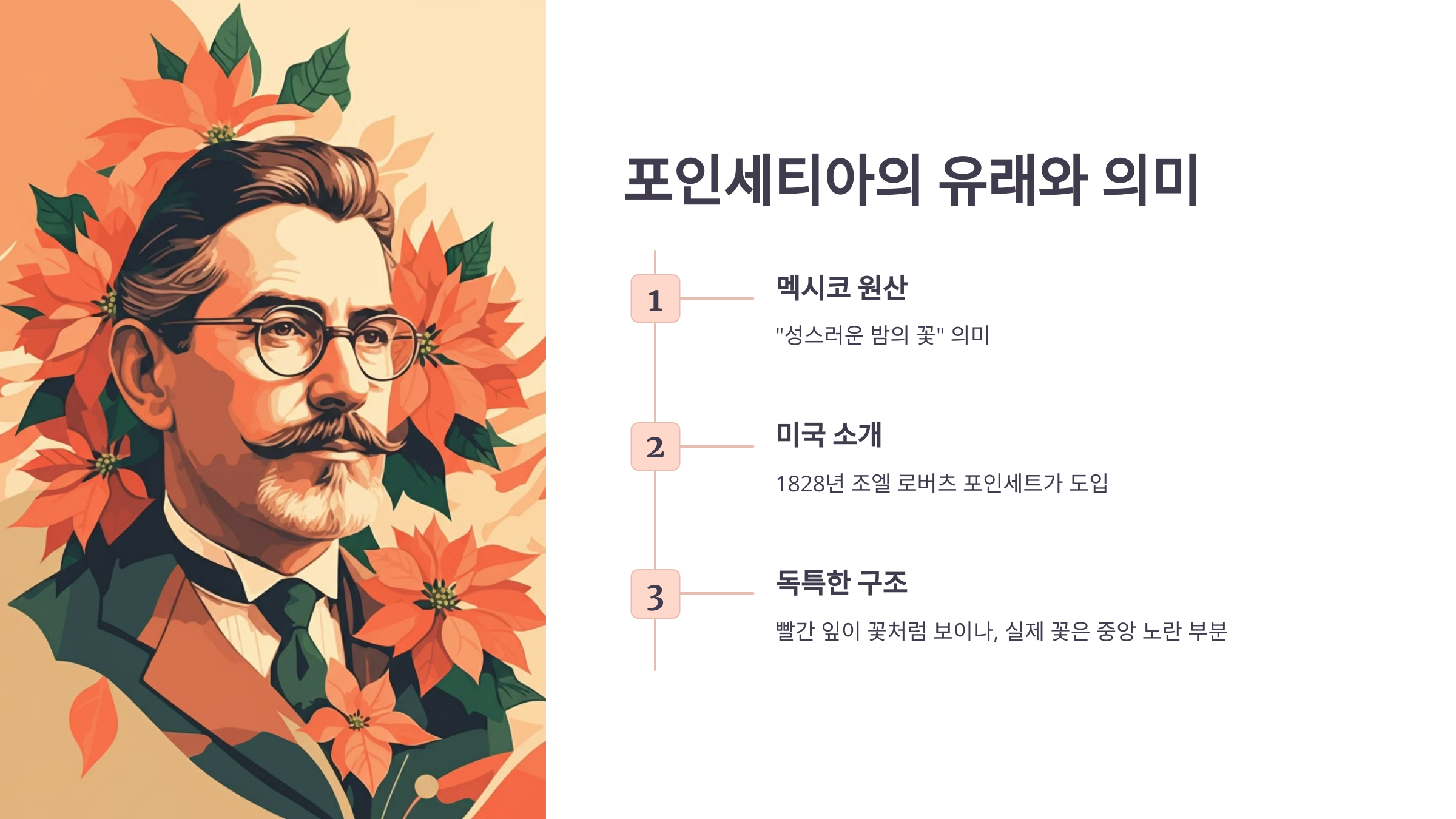 포인세티아는 원래 멕시코에서 자생하던 식물로, 현지에서는 "라 플로르 데 노체부에나(La Flor de Nochebuena)" 즉, "성스러운 밤의 꽃"으로 불립니다. 이 꽃은 크리스마스와 예수 탄생을 상징하며, 1828년 조엘 로버츠 포인세트(Joel Roberts Poinsett)라는 미국 외교관이 미국에 소개하면서 그의 이름을 따 "포인세티아(Poinsettia)"로 불리게 되었습니다.