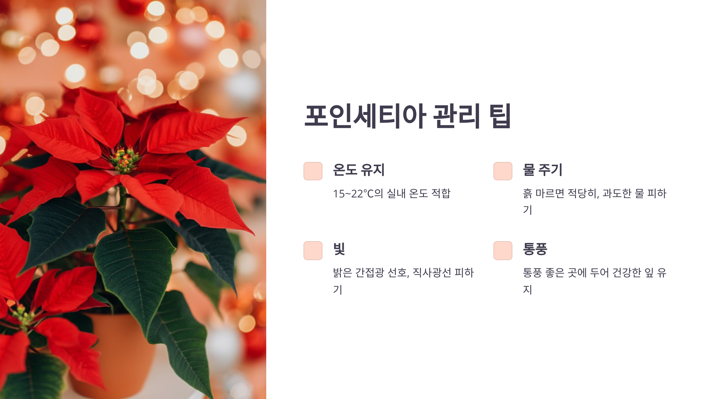 포인세티아는 크리스마스 시즌의 대표적인 꽃으로, 그 아름다운 빨간색과 초록색 잎은 홀리데이 분위기를 완벽하게 연출해 줍니다. 오늘은 포인세티아의 유래와 종류, 그리고 다양한 장식 아이디어를 소개하며 크리스마스를 더욱 화려하게 만들어보는 방법을 공유하겠습니다. 😊
