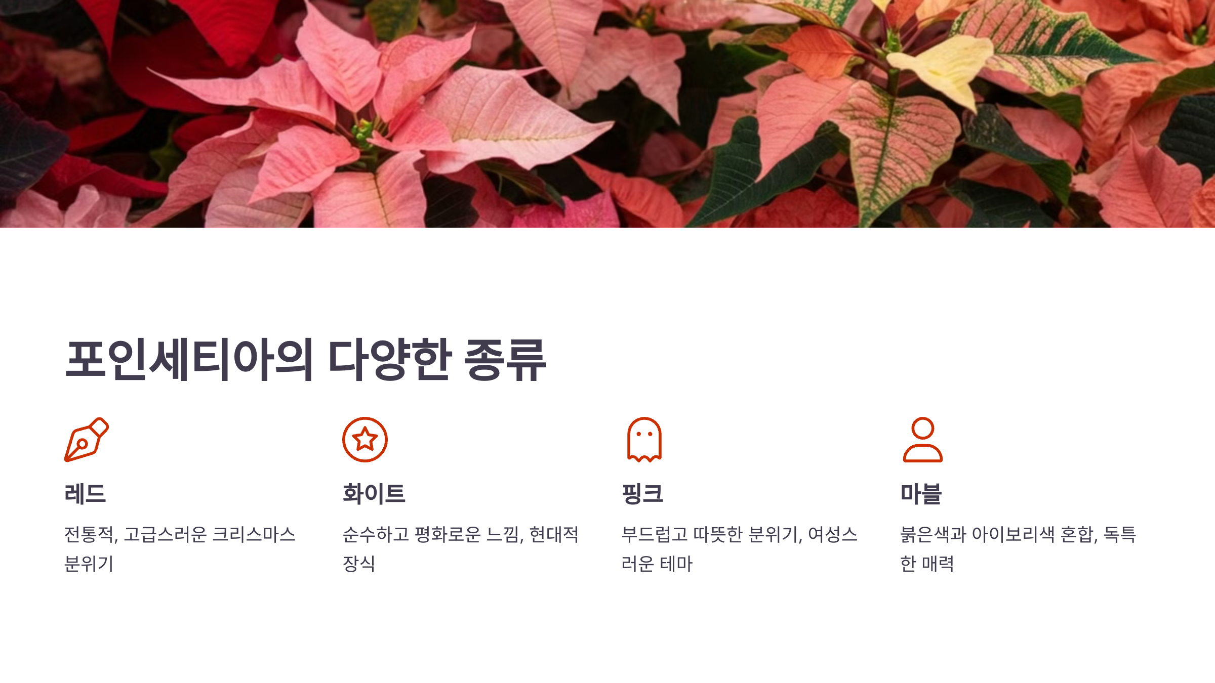 포인세티아는 그 자체로도 크리스마스 분위기를 완성해주는 특별한 꽃입니다. 빨간색, 초록색, 그리고 다양한 변종의 색상이 조화를 이루며 공간을 따뜻하게 밝혀줍니다. 크리스마스 시즌, 포인세티아를 활용해 집안과 마음을 가득 채워보세요. 사랑과 행복이 가득한 연말 보내시길 바랍니다! 🎅