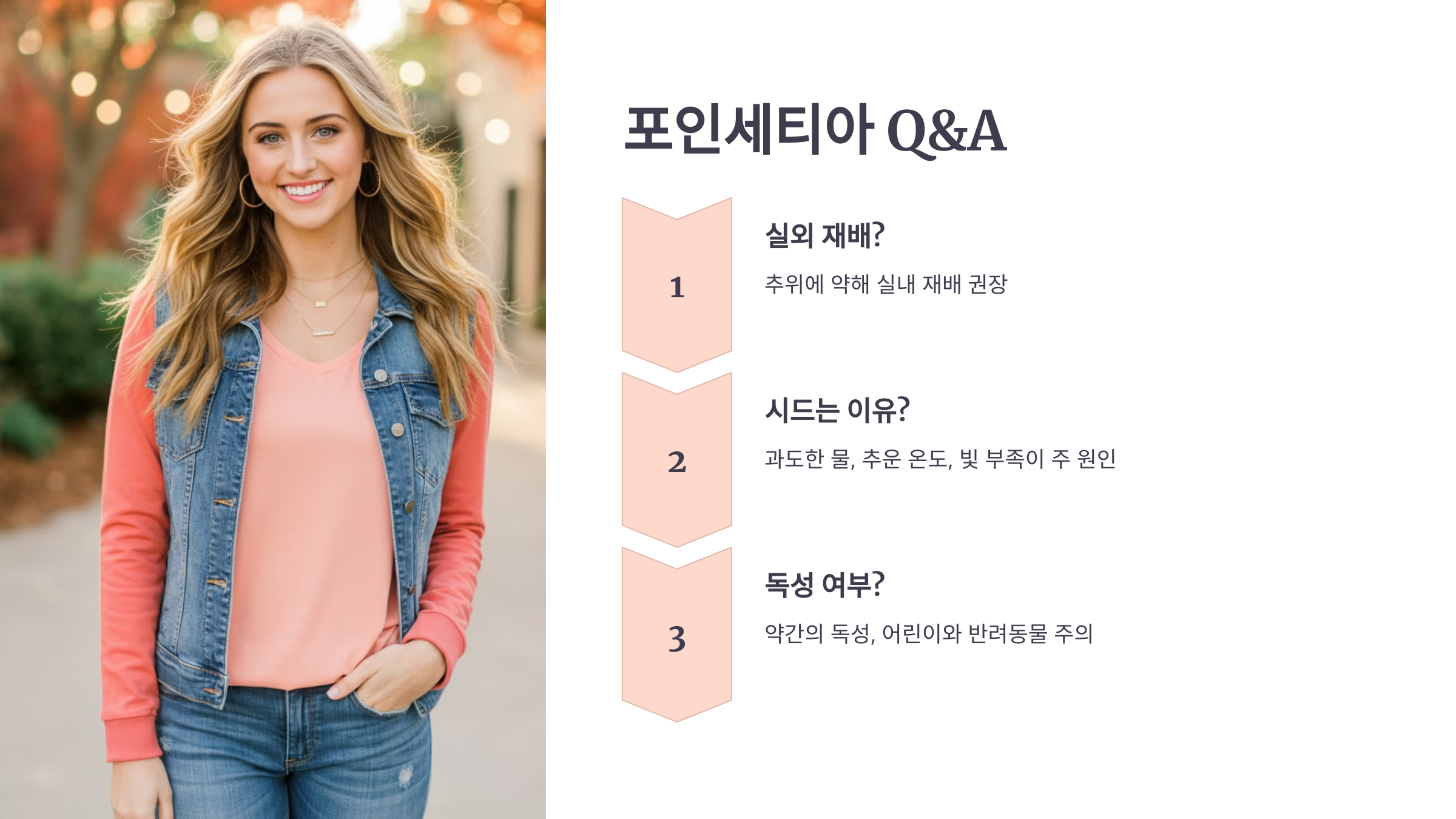 A3: 포인세티아의 잎은 독성이 약간 있으니, 어린아이나 반려동물이 섭취하지 않도록 주의하세요.