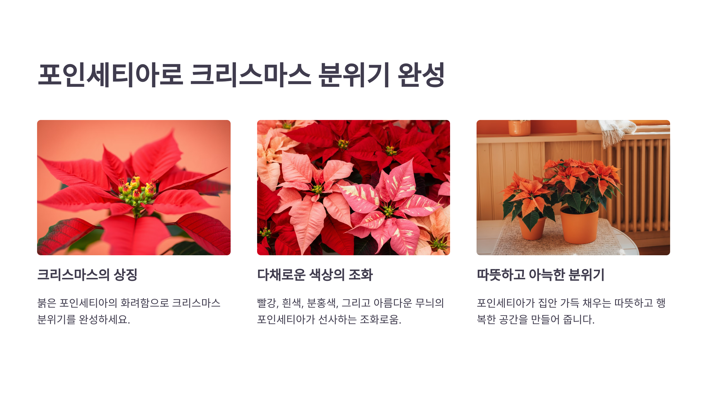 포인세티아는 그 자체로도 크리스마스 분위기를 완성해주는 특별한 꽃입니다. 빨간색, 초록색, 그리고 다양한 변종의 색상이 조화를 이루며 공간을 따뜻하게 밝혀줍니다. 크리스마스 시즌, 포인세티아를 활용해 집안과 마음을 가득 채워보세요. 사랑과 행복이 가득한 연말 보내시길 바랍니다! 🎅