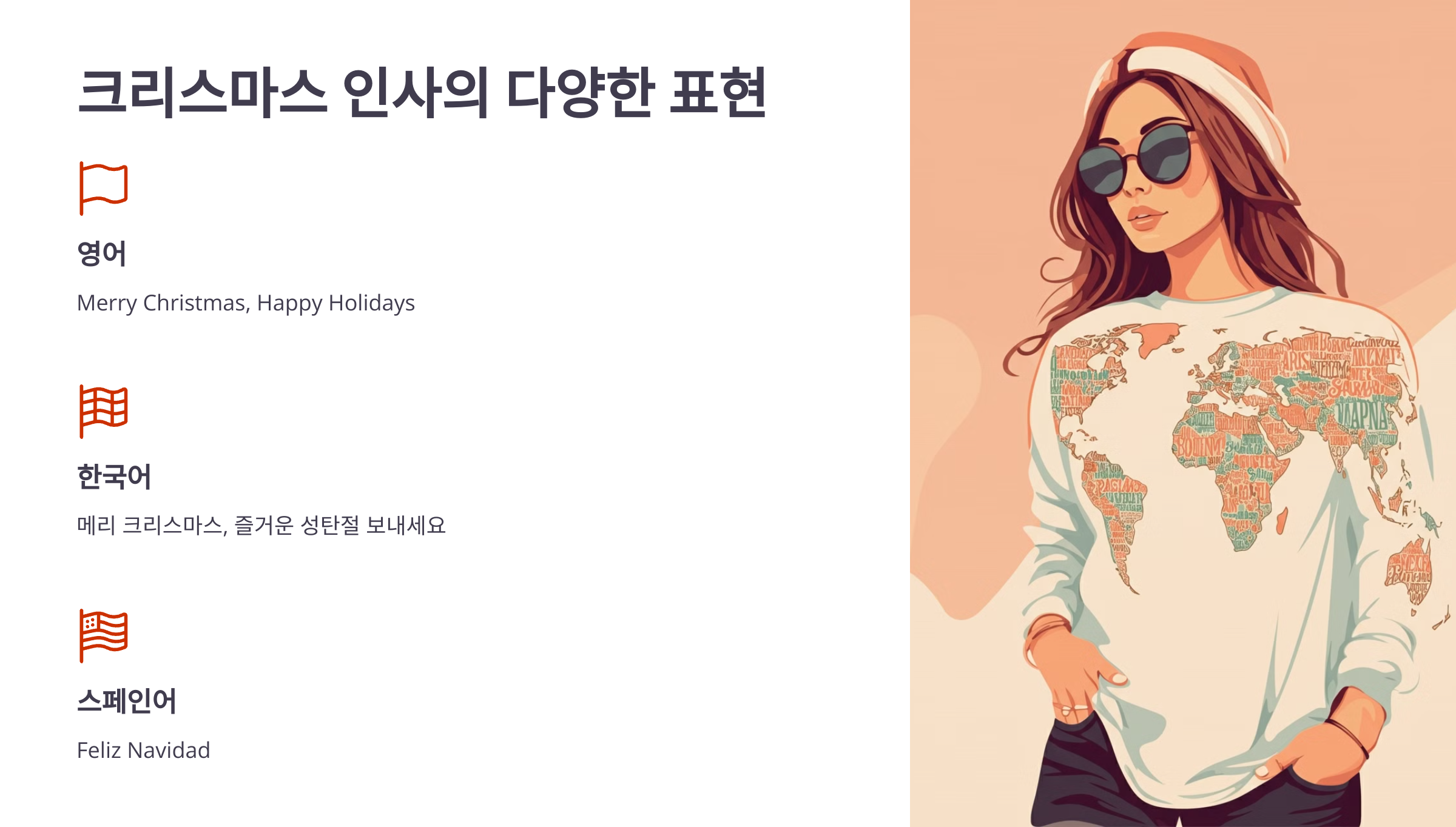 • 한국어: 메리 크리스마스, 즐거운 성탄절 보내세요.