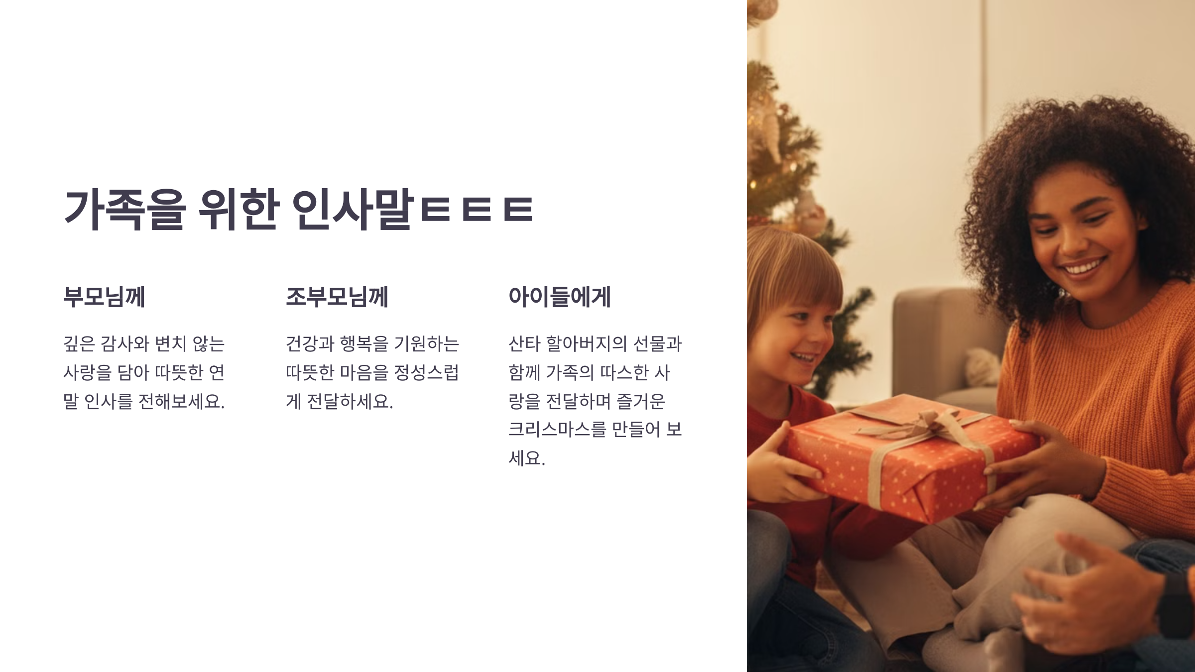 • "늘 저희 가족의 중심이 되어주셔서 감사해요. 크리스마스에도 건강과 행복이 가득하시길!"