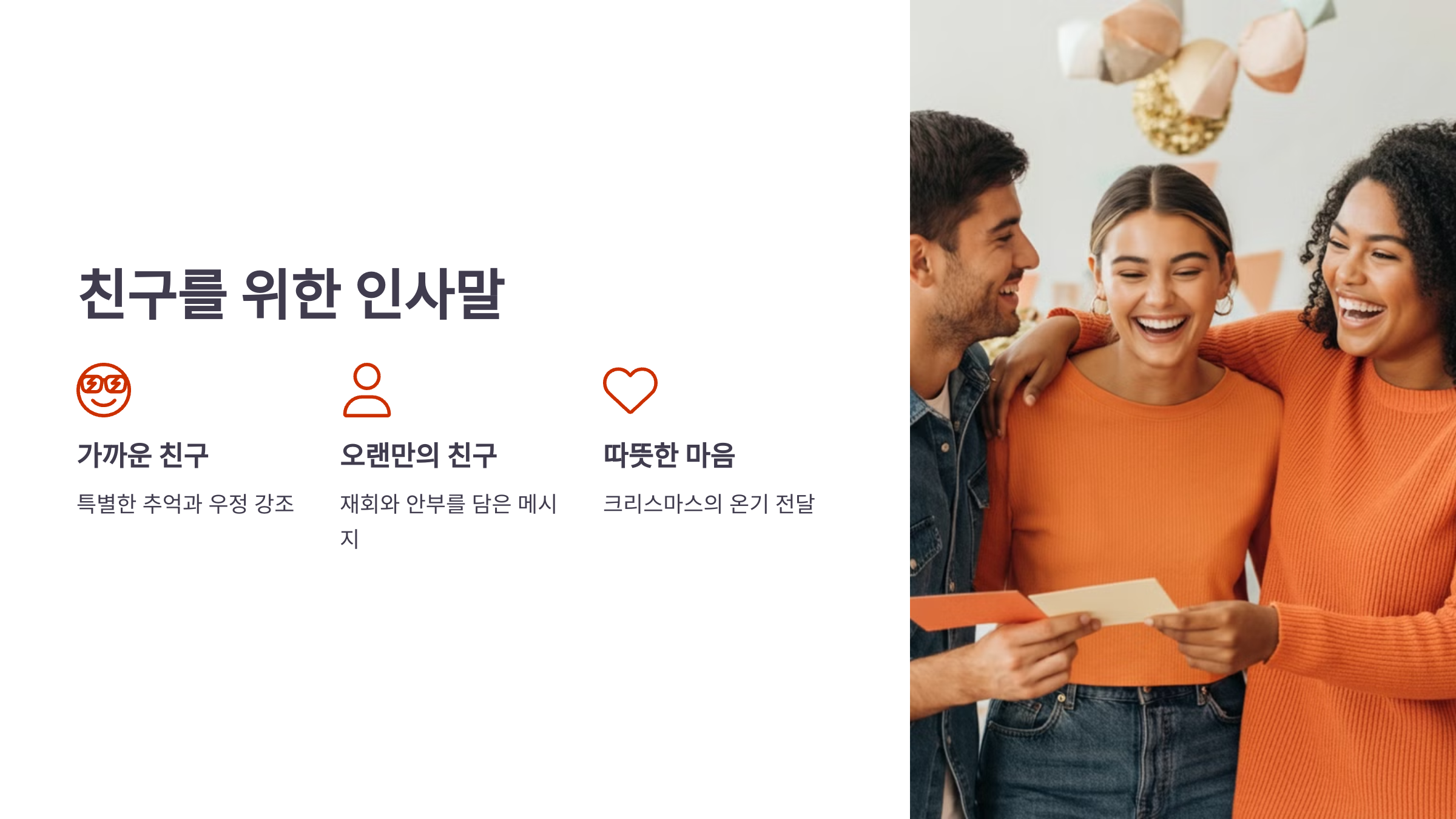• "오랜만이에요! 크리스마스를 맞아 안부 전합니다. 올 한 해도 잘 마무리하시고 따뜻한 연말 되세요."