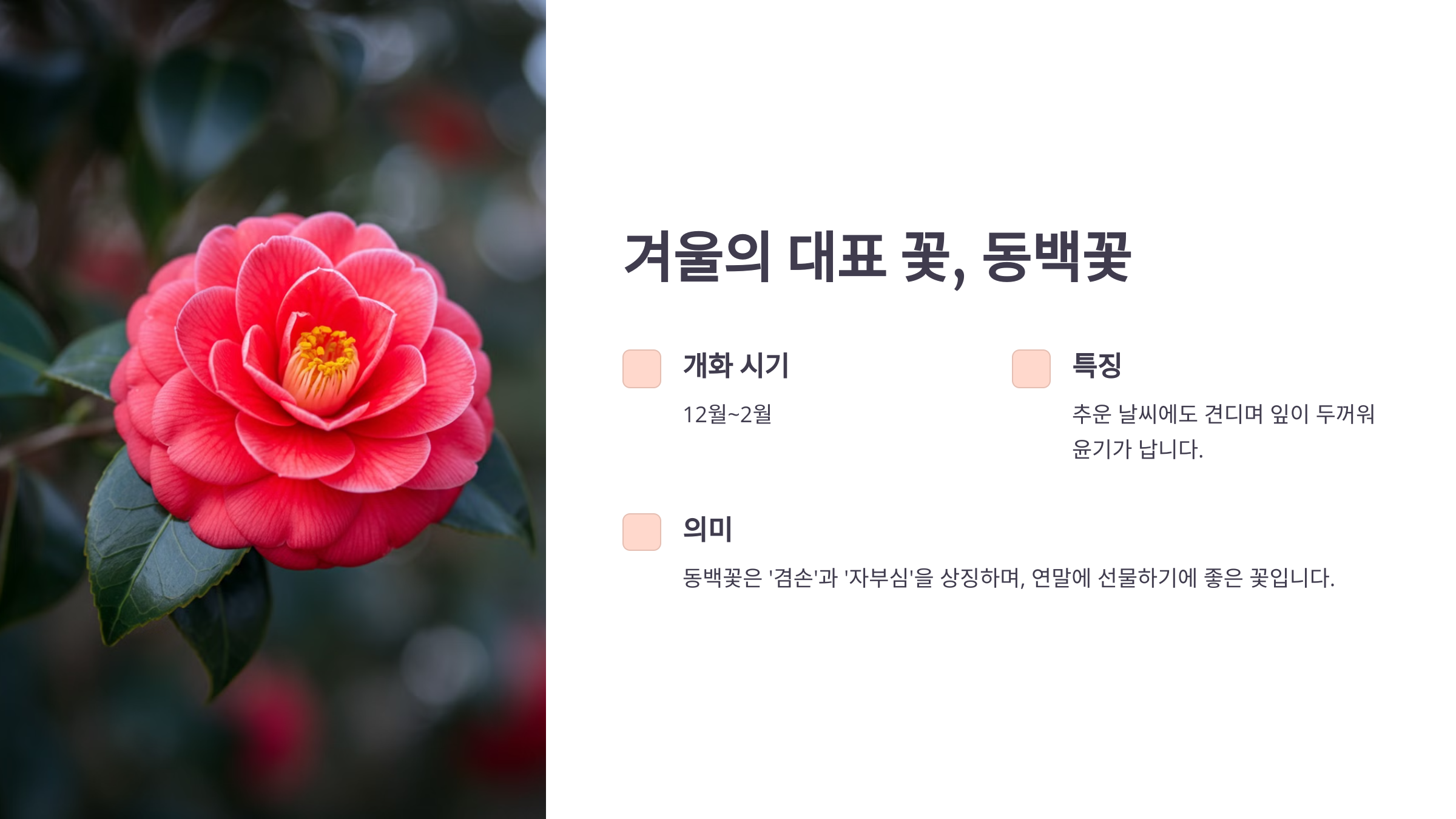 - 의미: 동백꽃은 '겸손'과 '자부심'을 상징하며, 연말에 선물하기에 좋은 꽃입니다.
