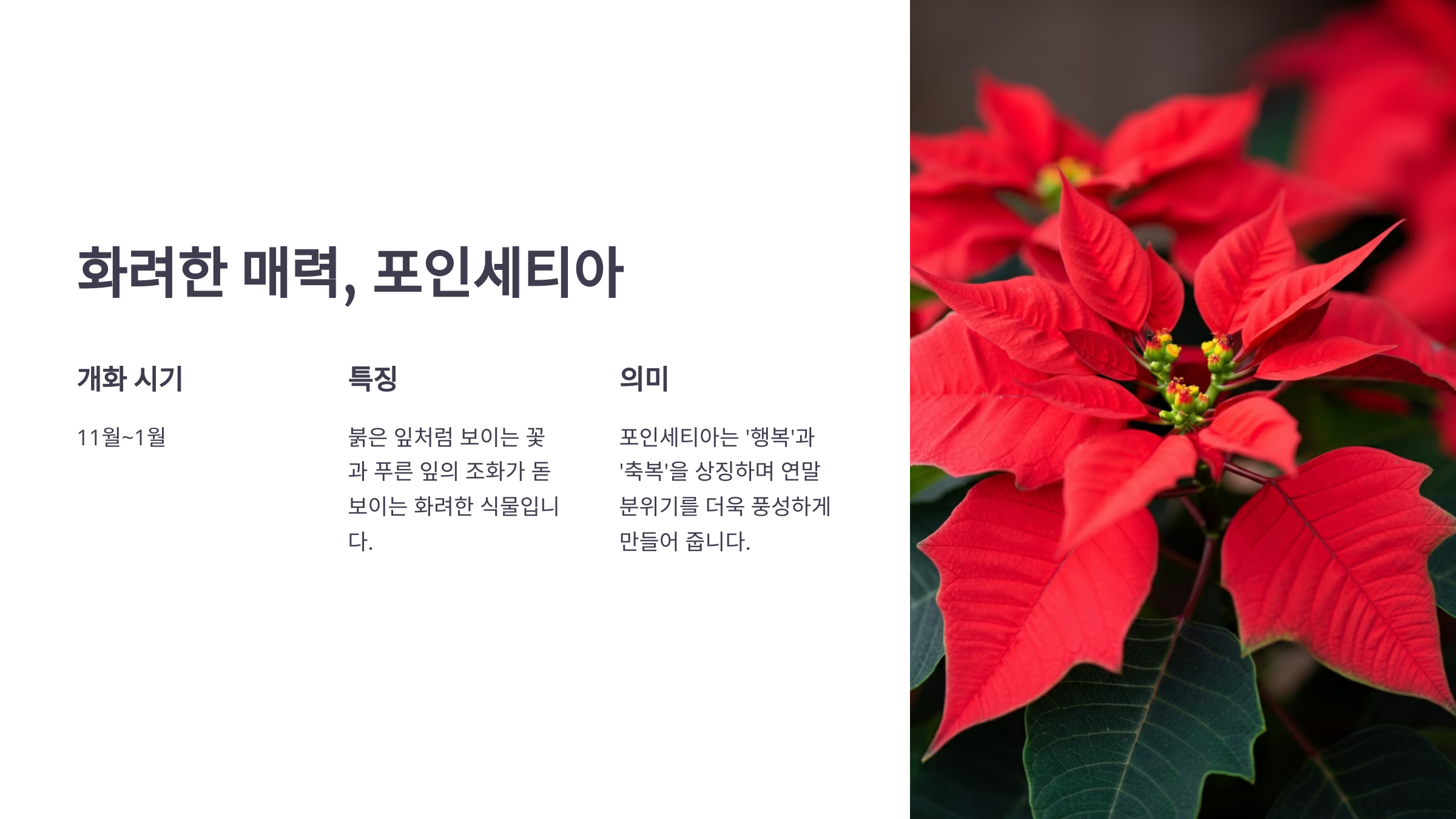 - 의미: 포인세티아는 '행복'과 '축복'을 상징합니다.
