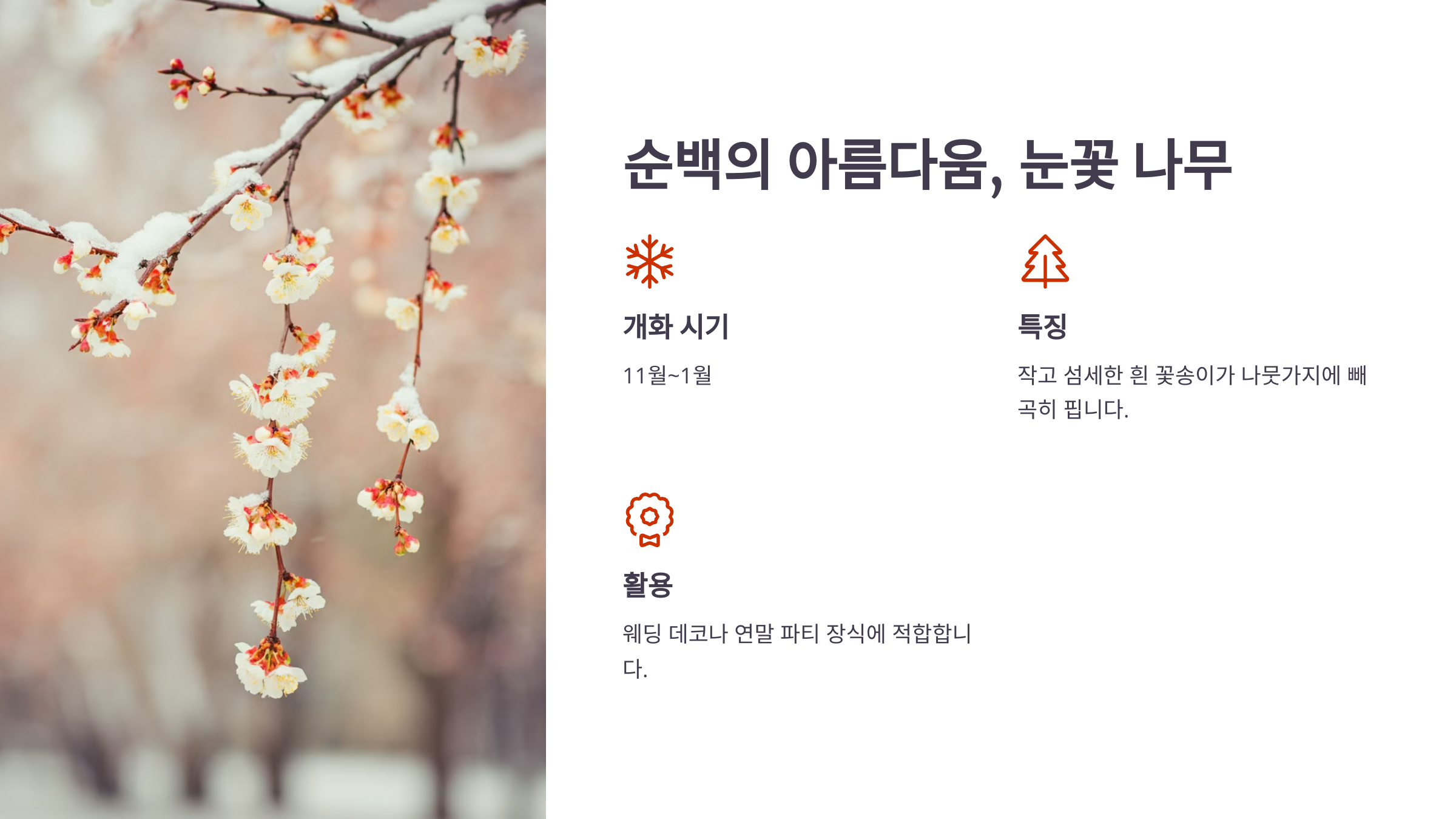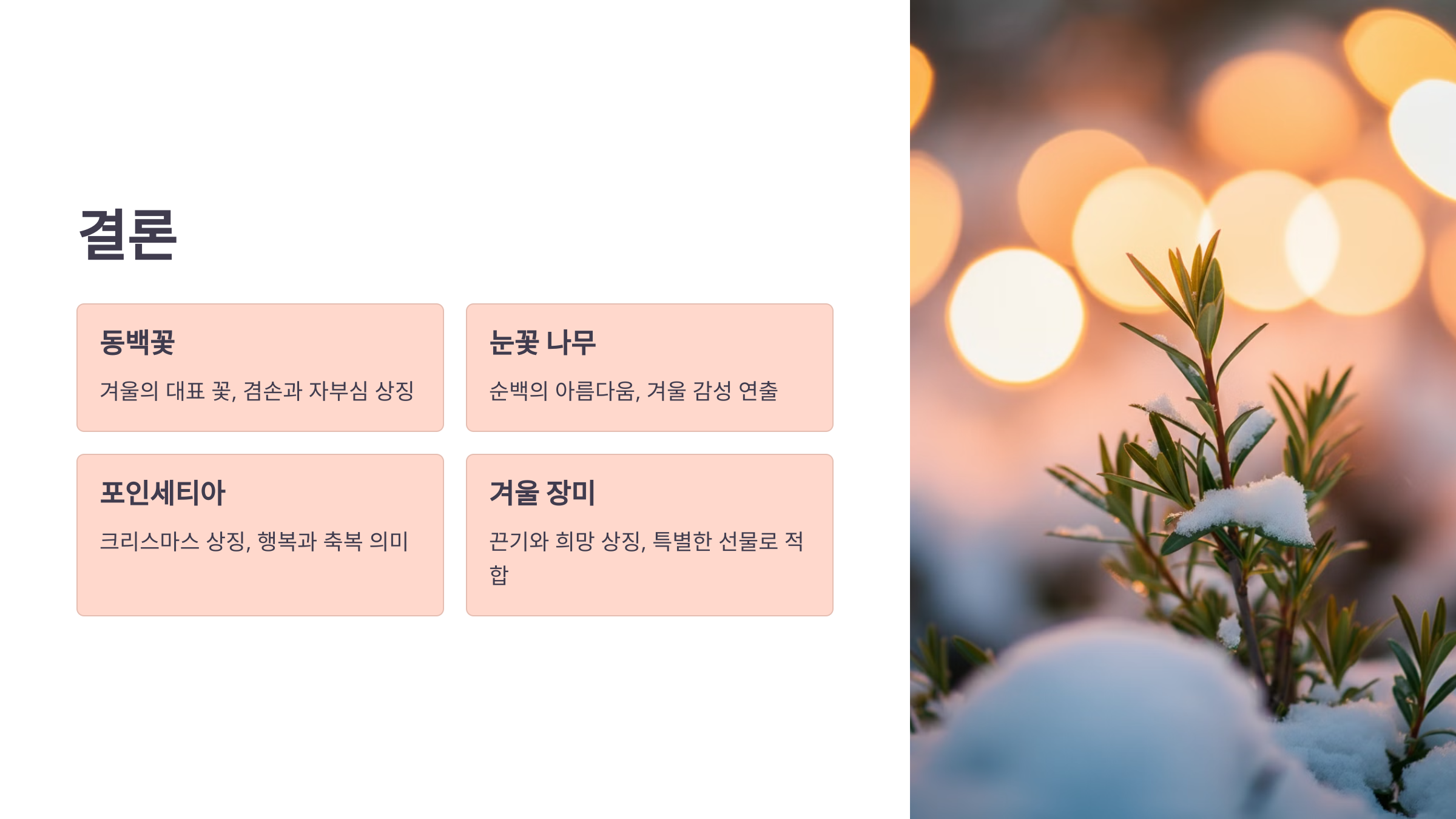 연말에는 이 꽃들로 공간을 꾸며 특별한 추억을 만들어 보세요. 자연이 주는 따스한 감동이 여러분의 마음에 깊이 스며들 것입니다. 🎉