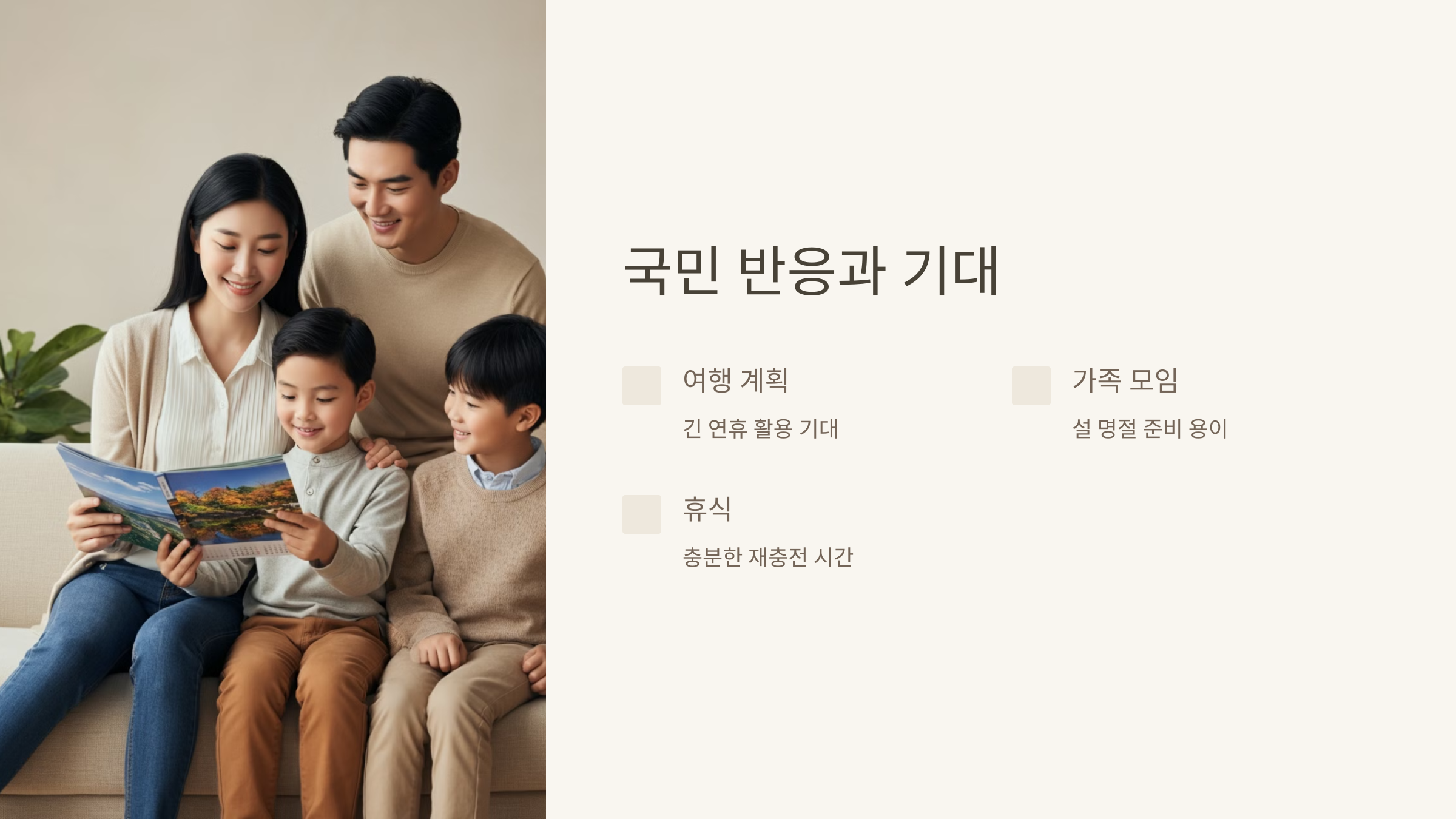 국민들은 이번 임시공휴일 지정 검토에 대해 큰 관심을 보이고 있습니다. 특히, 긴 연휴를 활용한 여행 계획이나 가족 모임 등을 준비하는 분들에게는 희소식이 될 전망입니다.
