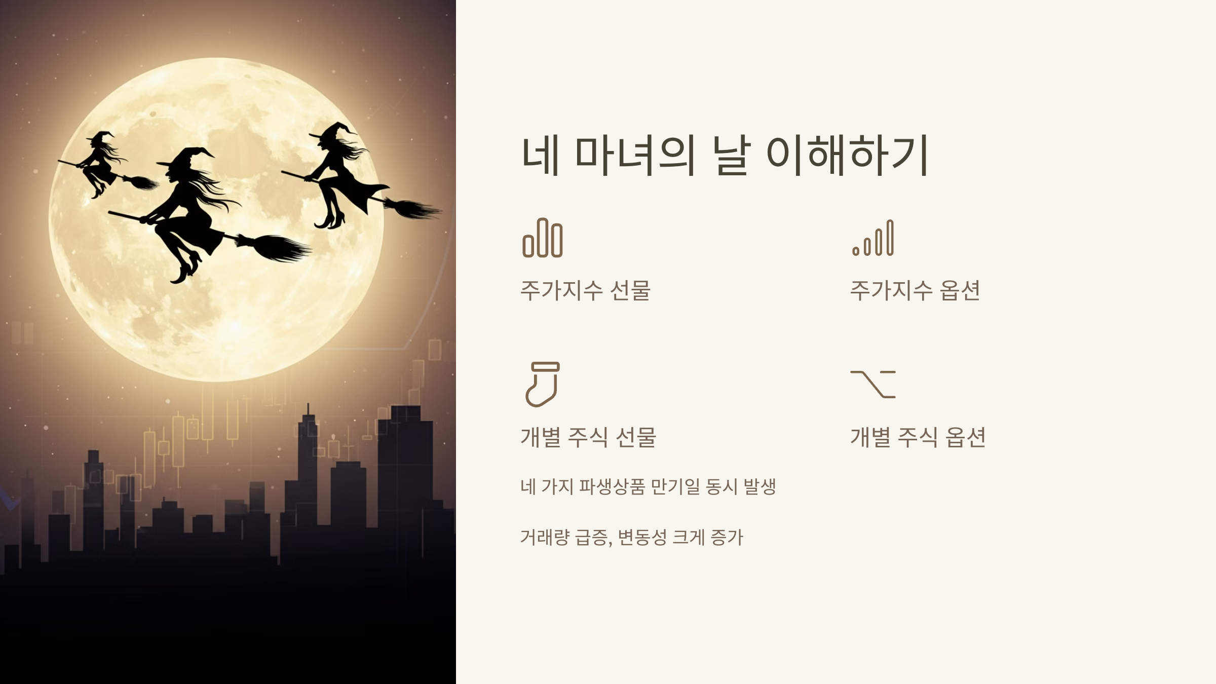 '네 마녀의 날'은 주가지수 선물, 주가지수 옵션, 개별 주식 선물, 개별 주식 옵션의 네 가지 파생상품의 만기일이 동시에 겹치는 날을 의미합니다. 이날에는 거래량이 급증하고 시장 변동성이 크게 증가할 수 있어 투자자들의 주의가 필요합니다.