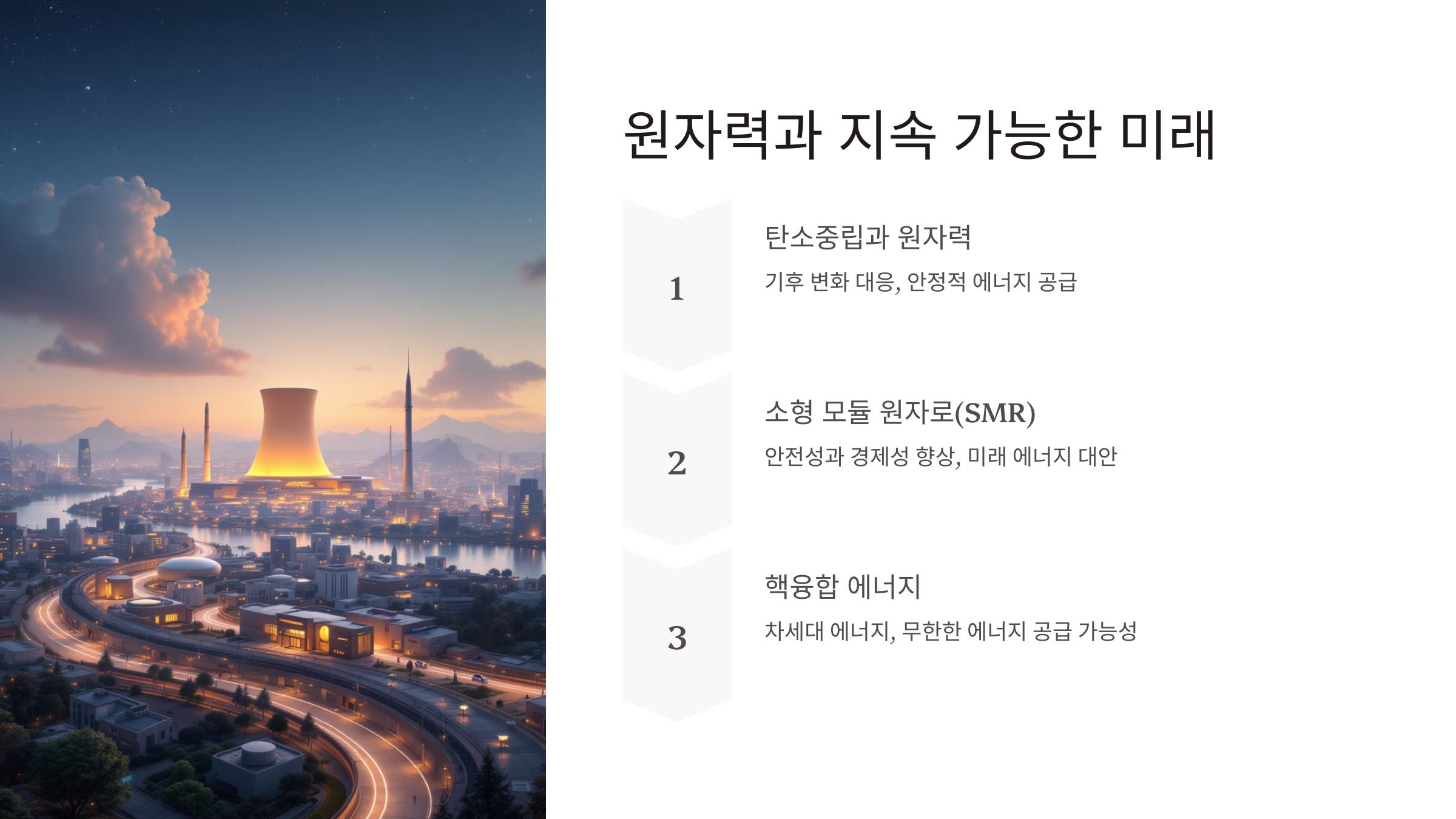 원자력 발전은 화석연료보다 온실가스 배출이 적고, 안정적으로 대규모 에너지를 공급할 수 있습니다.