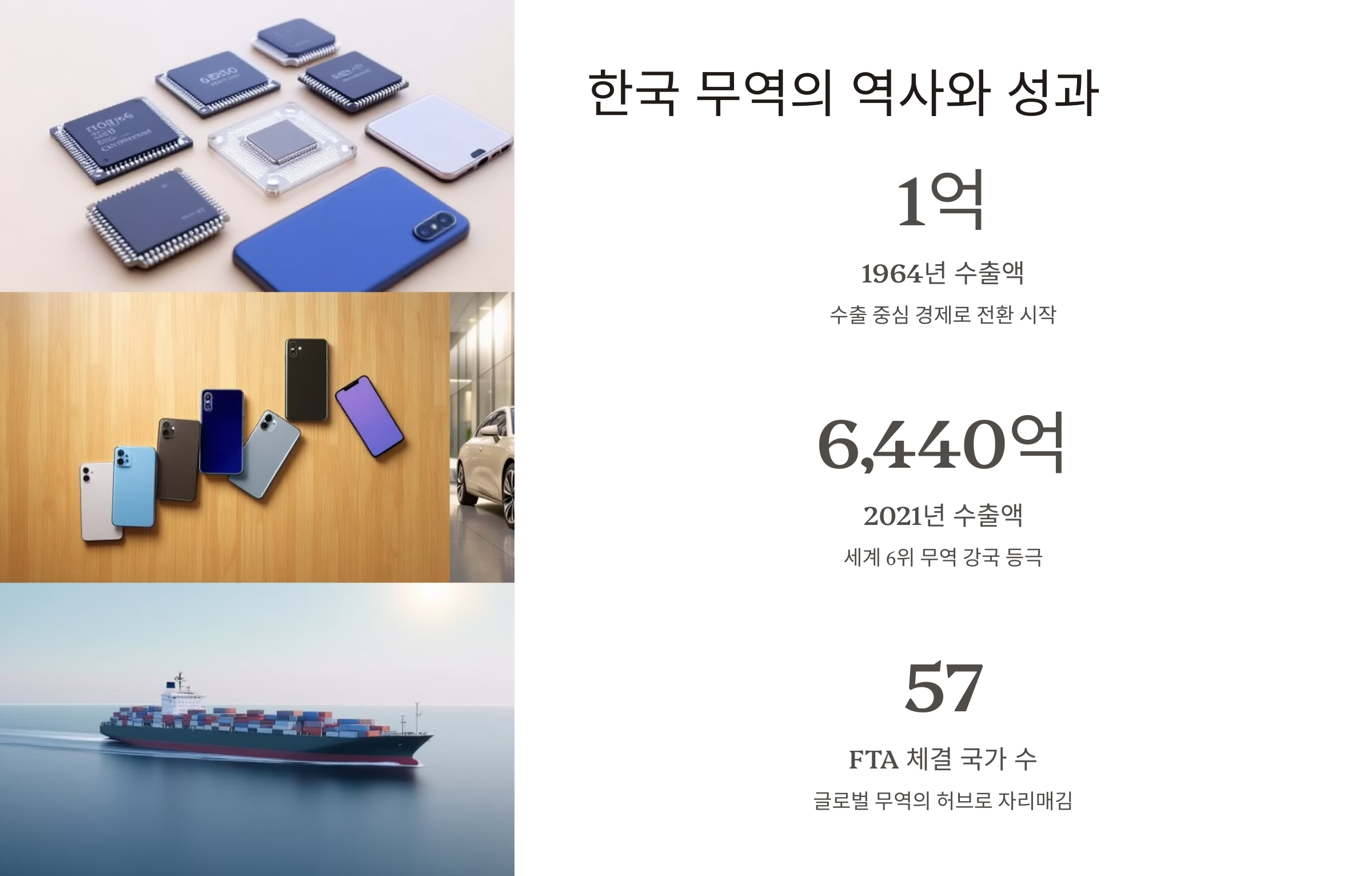 - 2021년: 수출 6,440억 달러 돌파, 세계 6위 무역 강국 등극