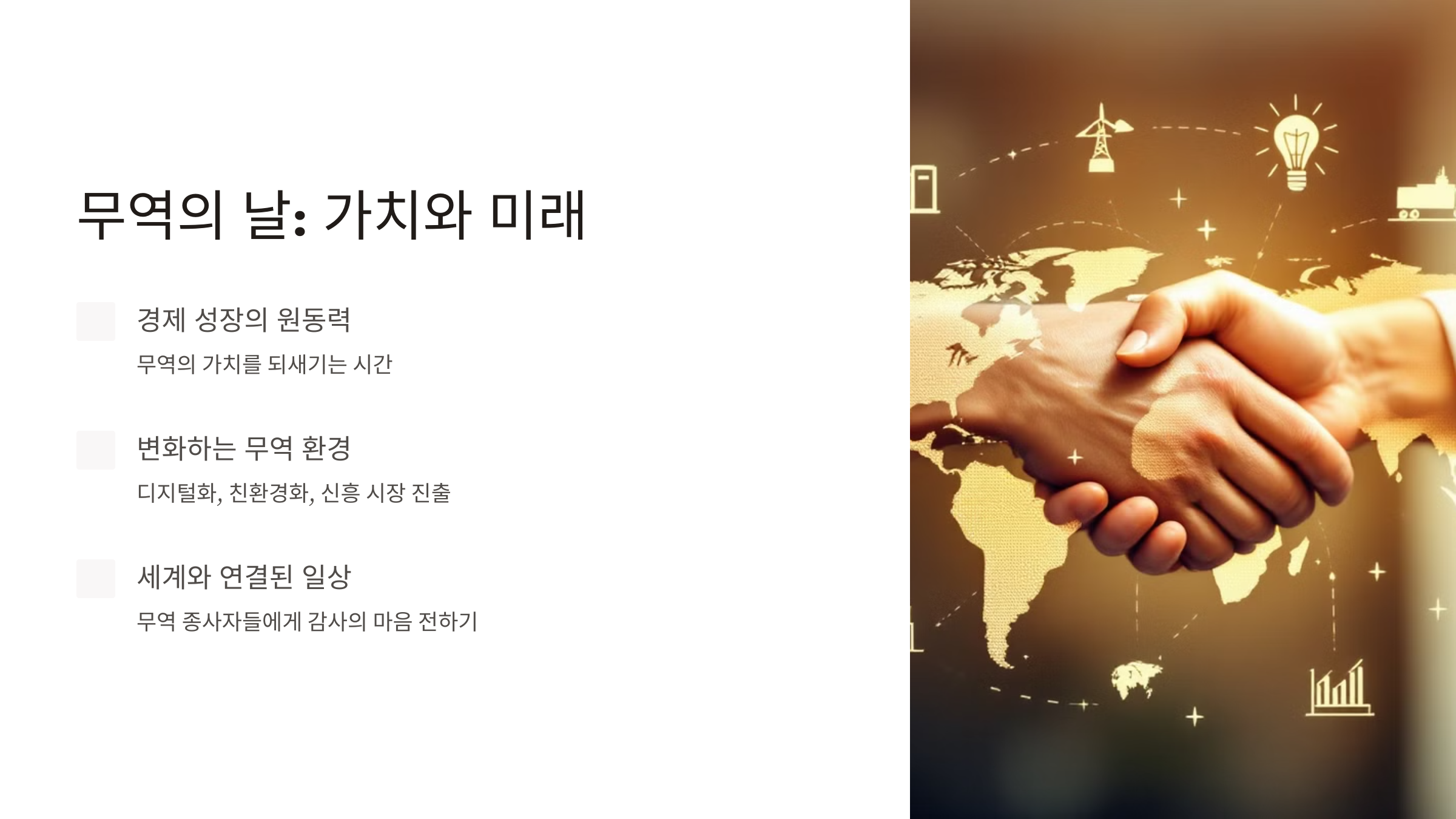 무역은 상품뿐만 아니라 문화, 기술, 아이디어를 교환하며 세계와 소통할 기회를 제공합니다.