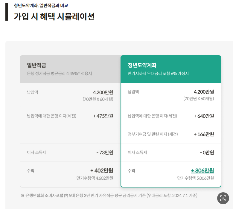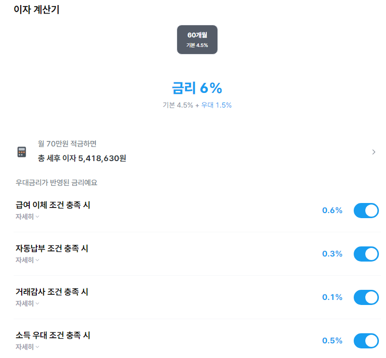 • 높은 이자율 제공: 기본 금리 연 4.5%에 우대 금리 최대 1.5%p를 더해 최고 연 6.0%의 금리를 받을 수 있습니다.